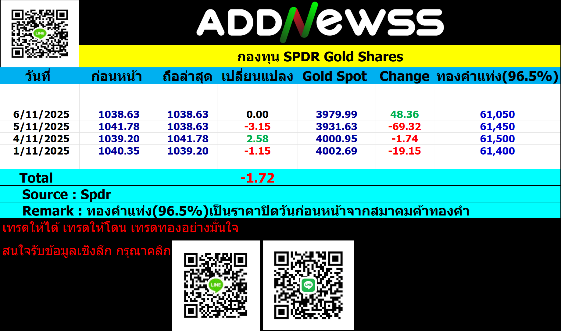 ยอดสะสม Spdr ประจำวันที่ 6 พฤศจิกายน 2025 📅 2025-11-06 07:52 ✎ bom999 🗇 Gold 👍 - แชร์โพสต์นี้ ยอดสะสม Spdr ย้อนหลังประจำเดือนตุลาคม 2025 https://addnewss.news/post/6903fd6f753c82c2f202c19e