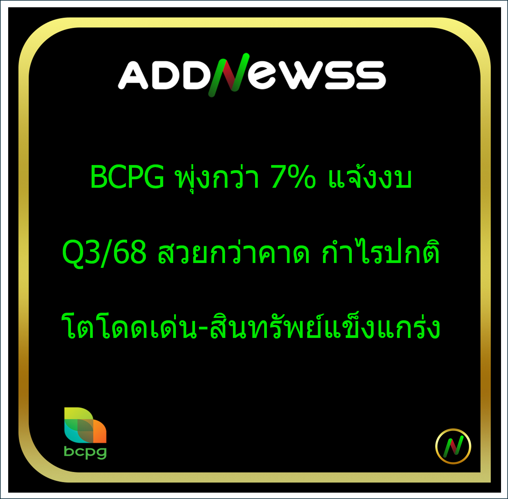 IQ> HILITE: BCPG พุ่งกว่า 7% แจ้งงบ Q3/68 สวยกว่าคาด กำไรปกติโตโดดเด่น-สินทรัพย์แข็งแกร่ง