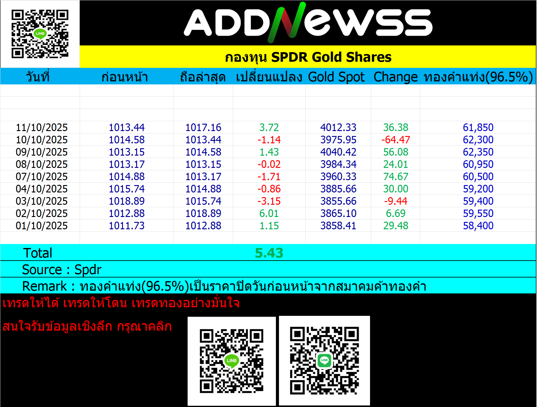 ยอดสะสม Spdr ประจำวันที่ 11 ตุลาคม 2025 📅 2025-10-11 10:37 ✎ bom999 🗇 Gold 👍 - แชร์โพสต์นี้ ยอดสะสม Spdr ย้อนหลังประจำเดือนกันยายน 2025 https://addnewss.news/post/68db1e83916829d3582a475d