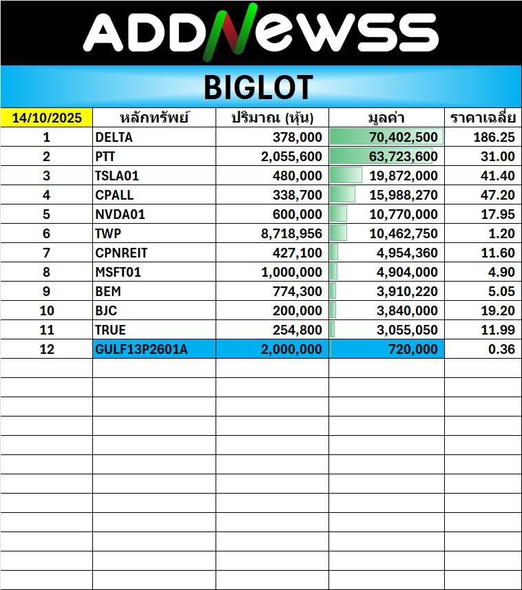 🔥BigLot 📅 14/10/2025 DELTA มีมูลค่าสูงสุด 70.4 ล้าน ที่ราคาเฉลี่ย 186.25 บ.