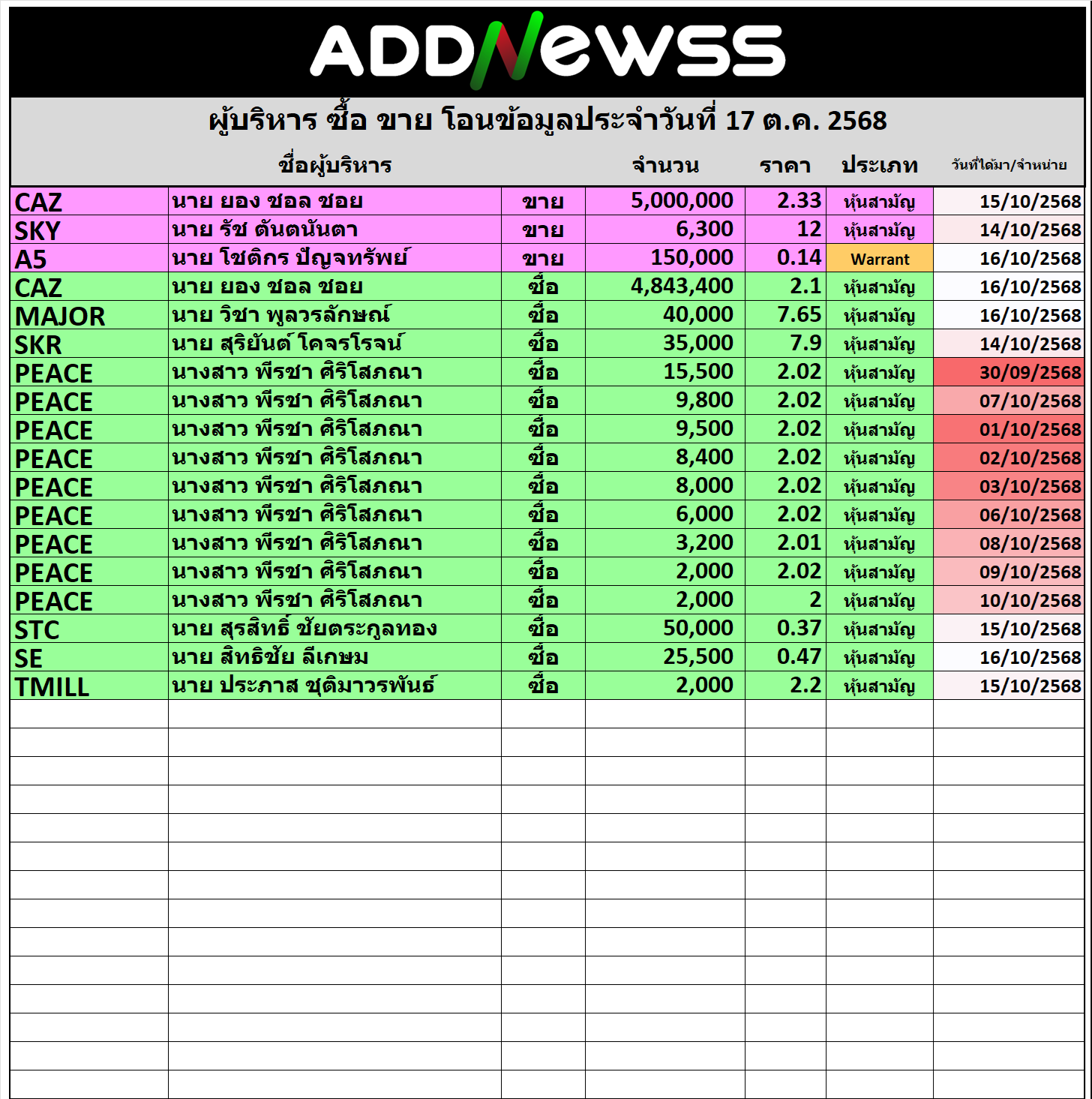 🔥🔥สรุปผู้บริหาร ซื้อ ขาย โอน  📅 วันรายงาน 17/10/2025