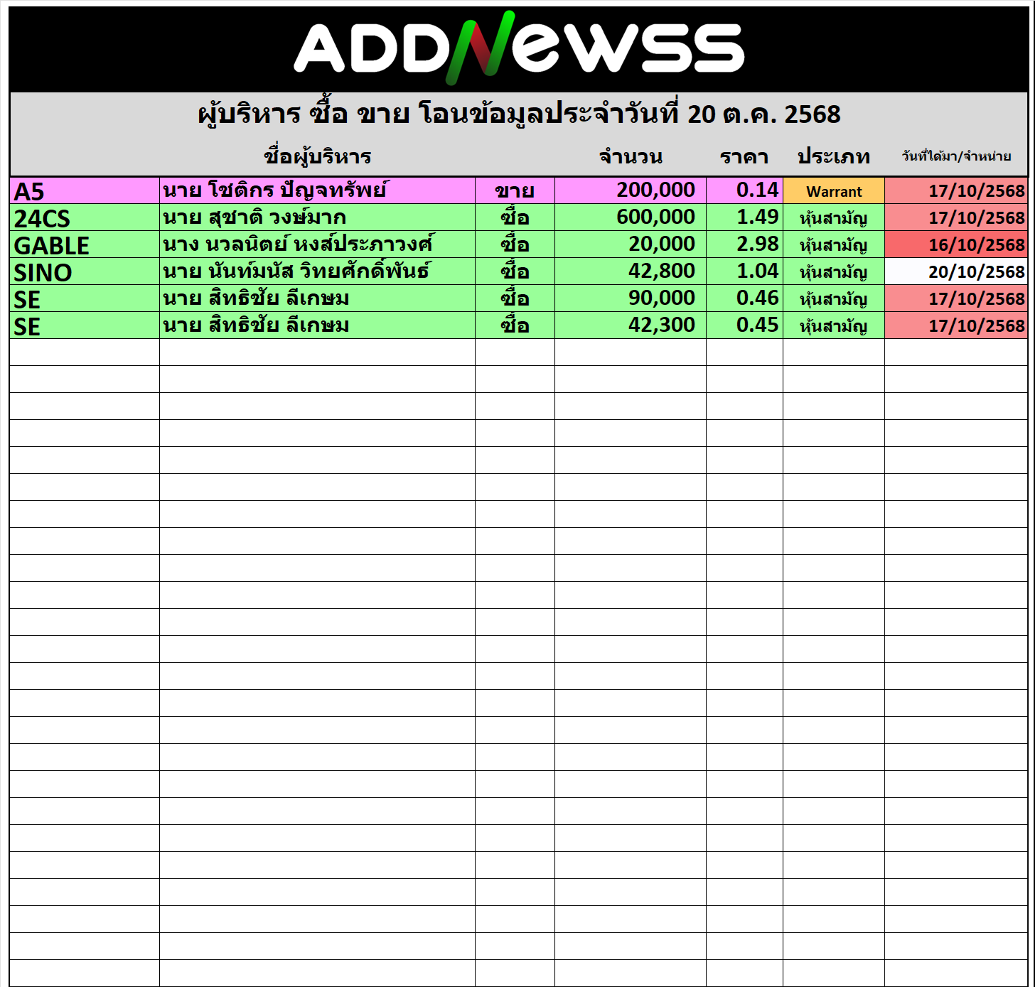 🔥🔥สรุปผู้บริหาร ซื้อ ขาย โอน  📅 วันรายงาน 20/10/2025