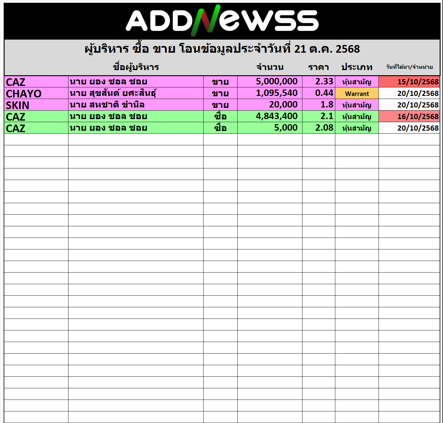 🔥🔥สรุปผู้บริหาร ซื้อ ขาย โอน  📅 วันรายงาน 21/10/2025