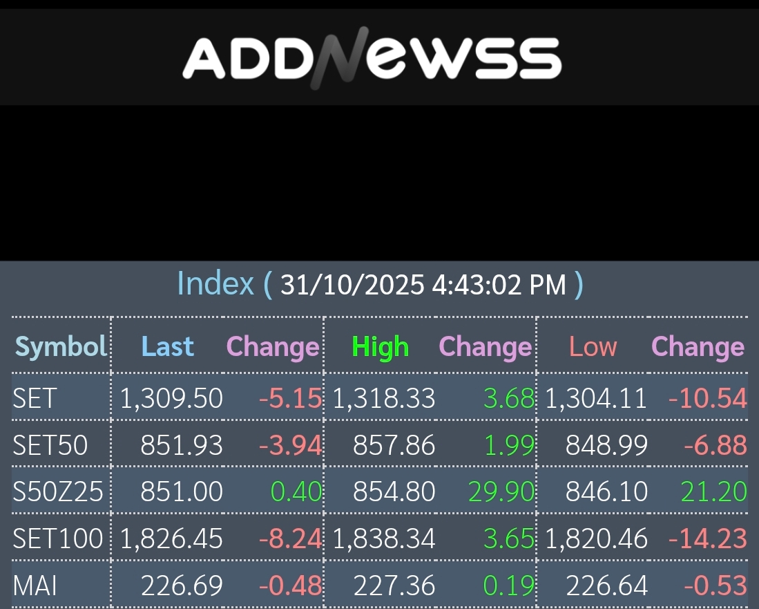 📊เย็นวันนี้ดัชนีตลาดหุ้นไทยปิดที่ 1,309.50 ลดลง -5.15 จุด หรือ -0.39%