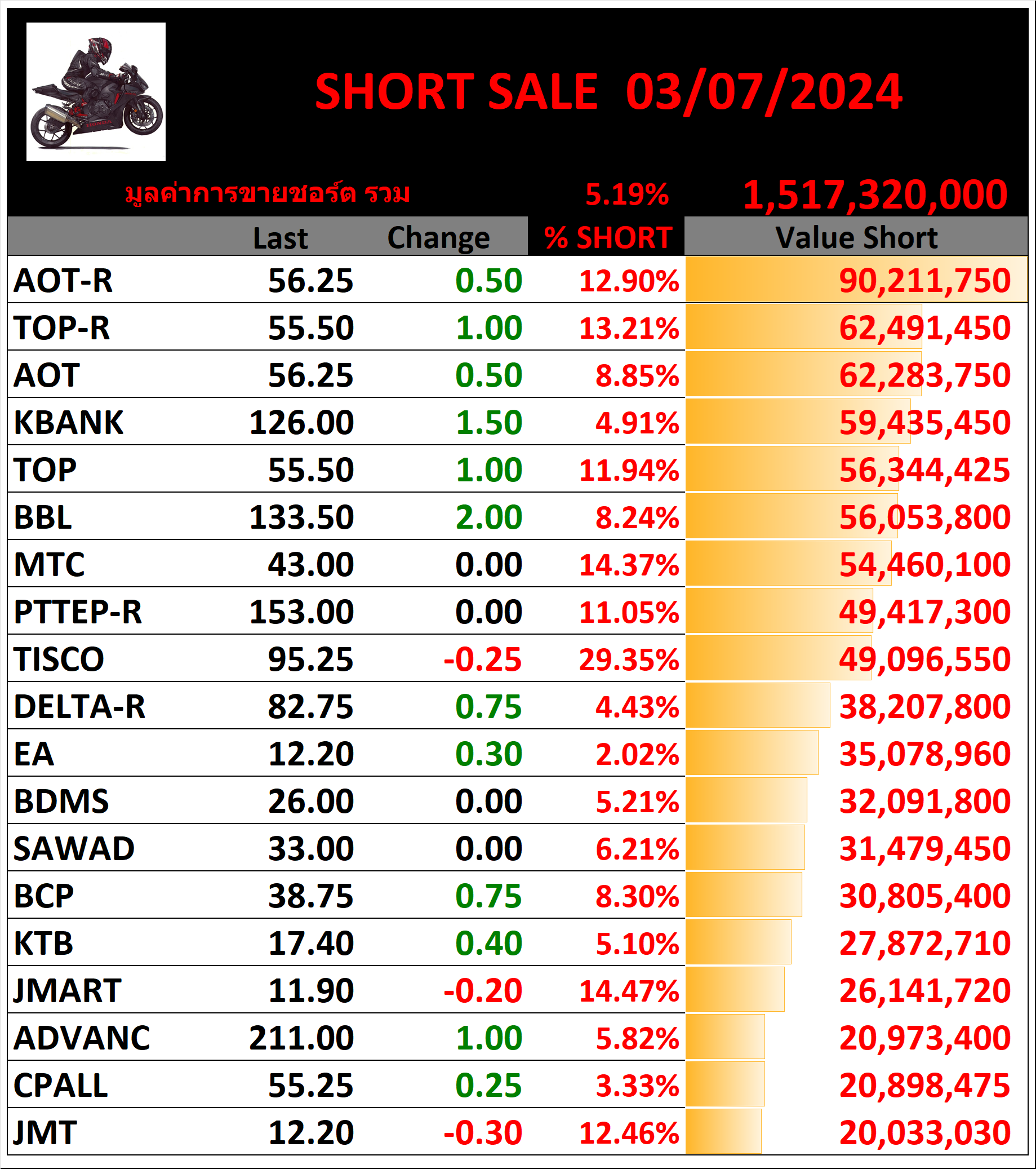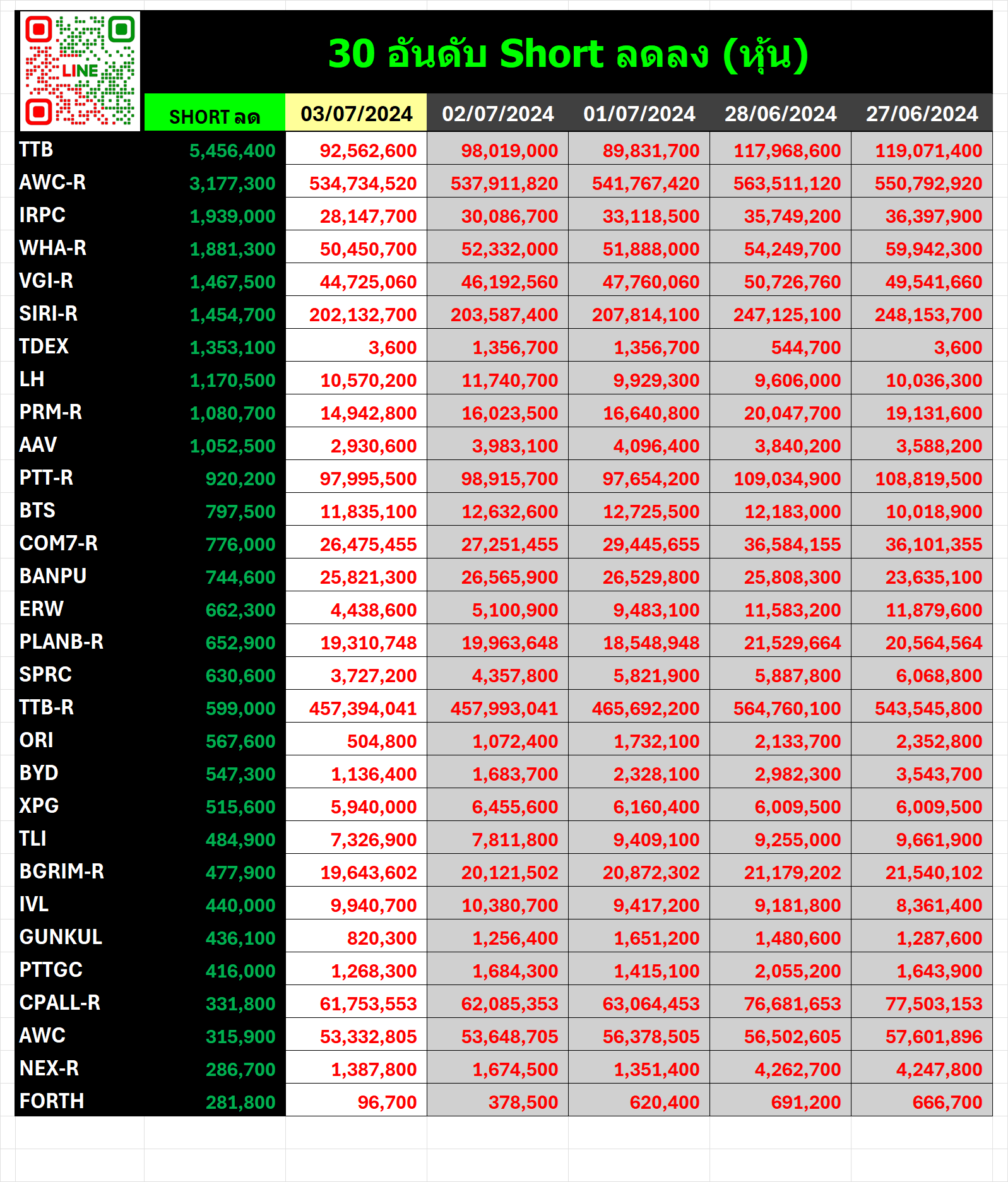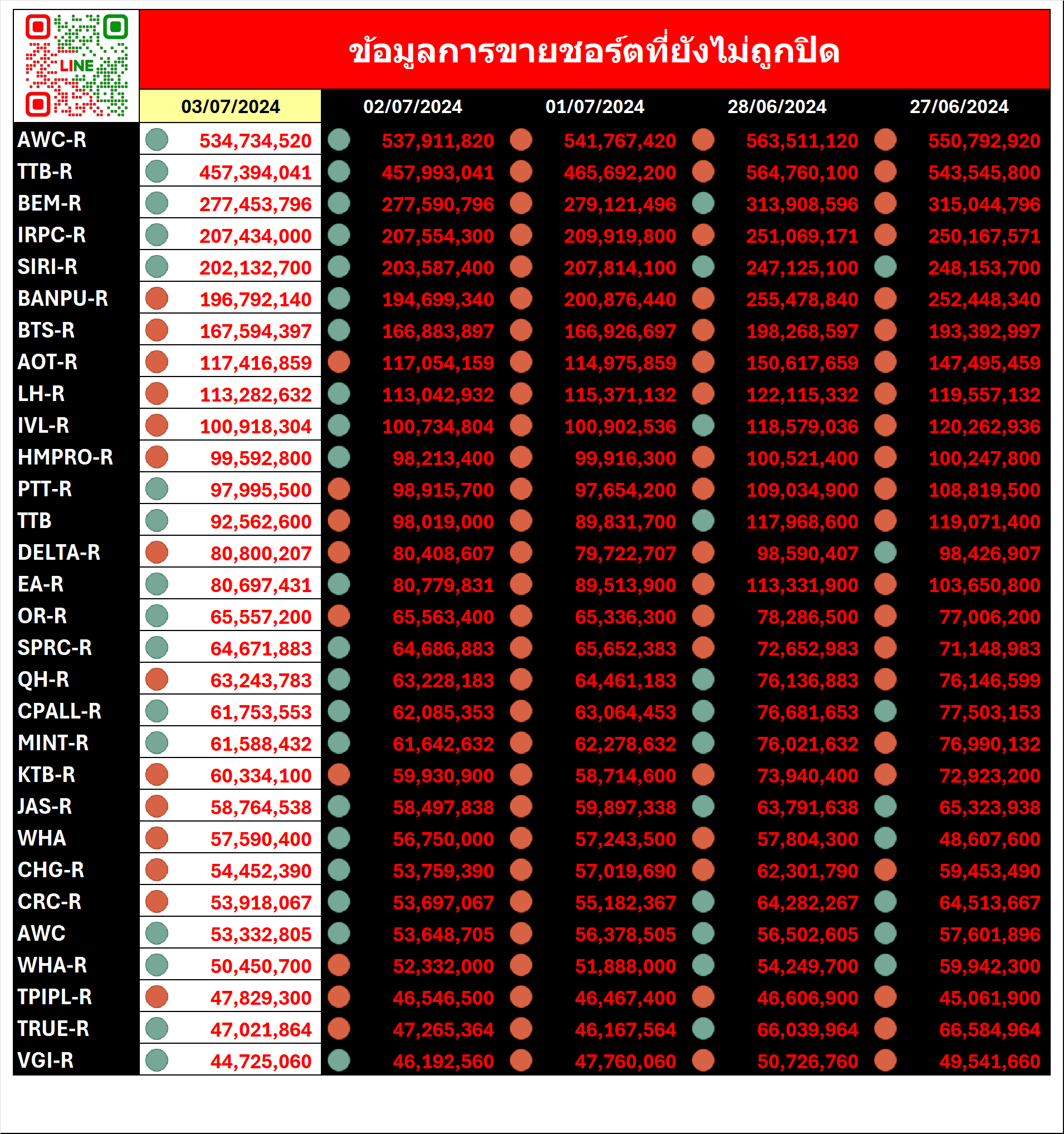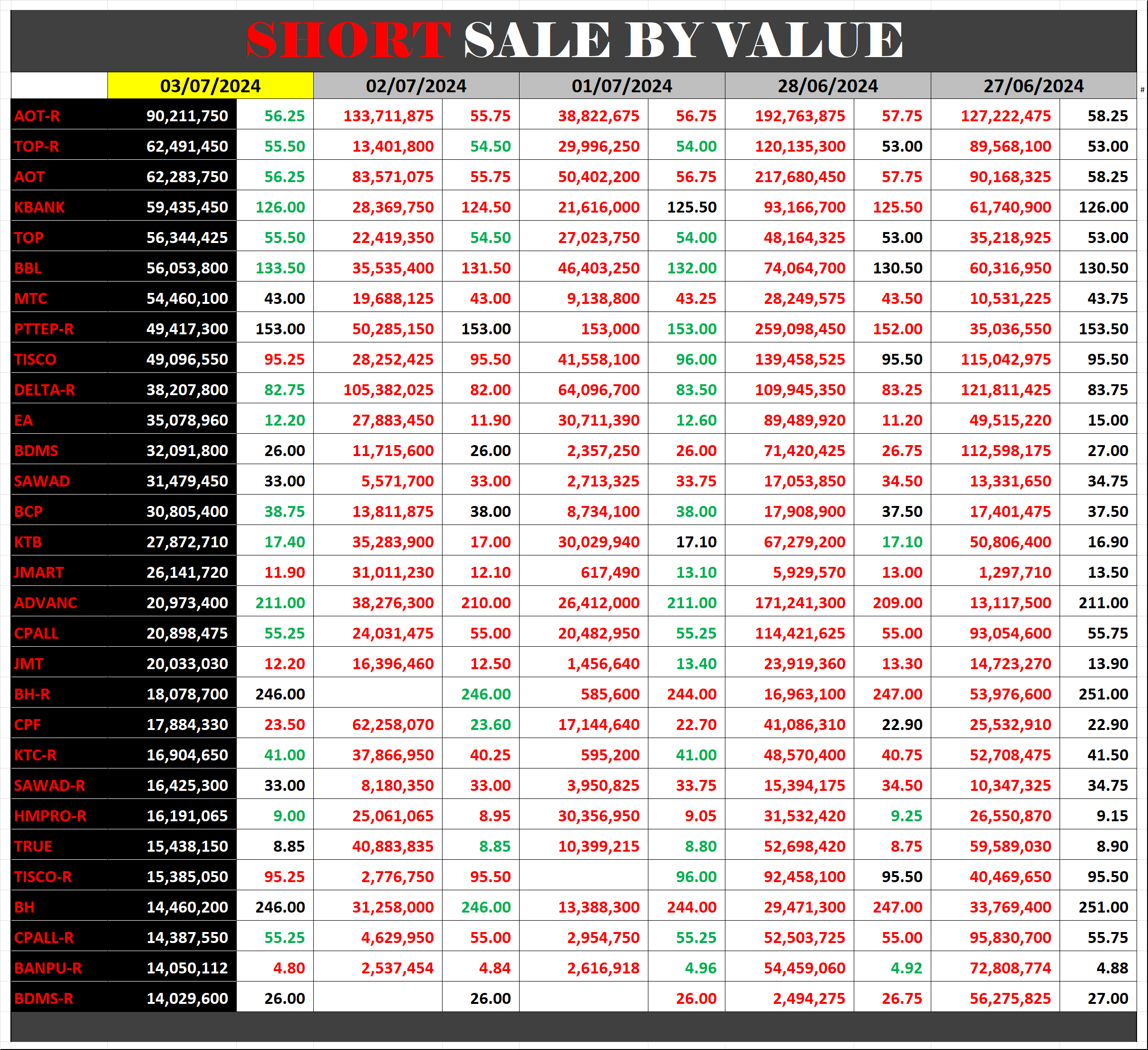 🔴🔴30อันดับ Short Sale ที่ยังไม่ได้ปิด🔴🔴📅 3/7/2024