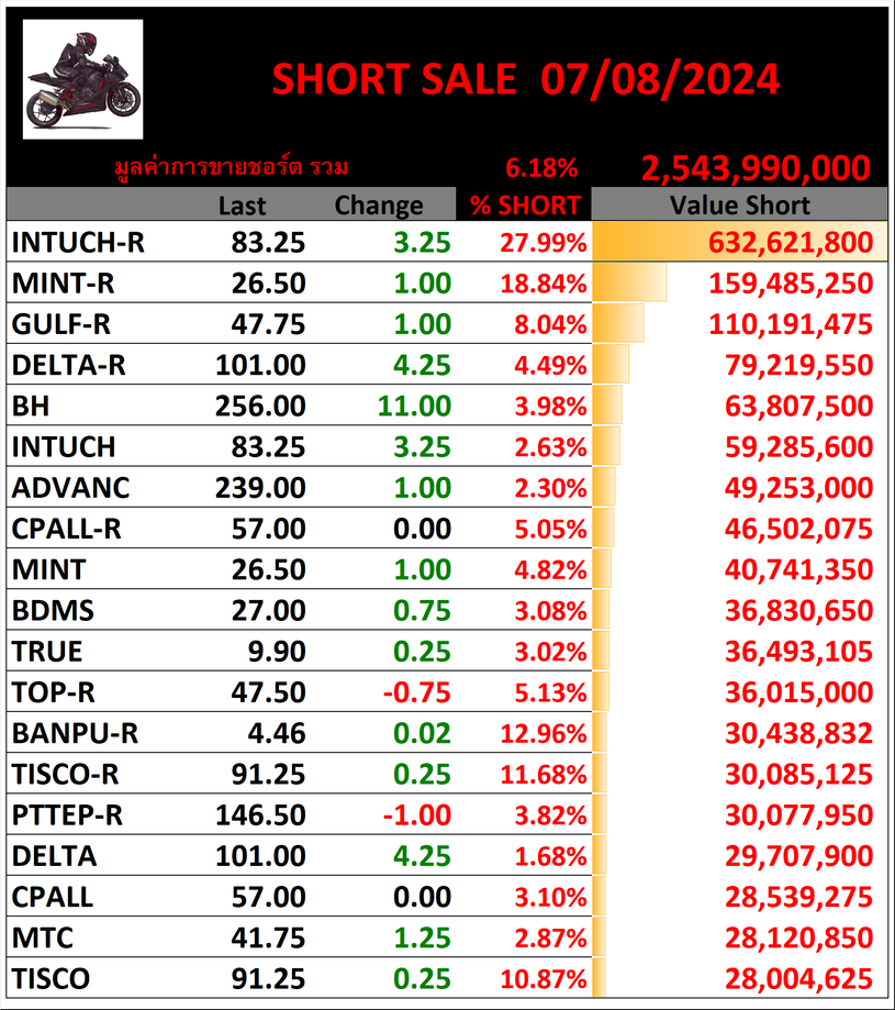 🔴🔴30อันดับ Short Sale ที่ยังไม่ได้ปิด🔴🔴📅 7/8/2024