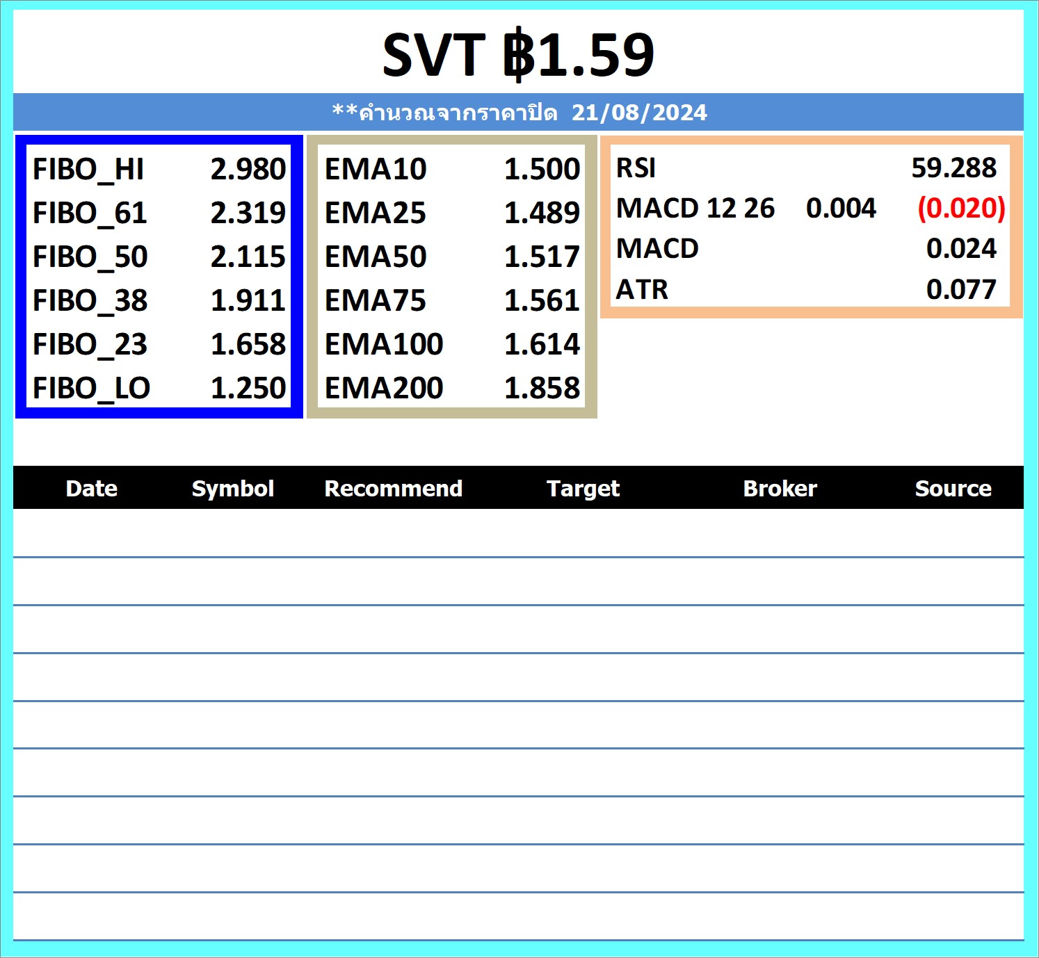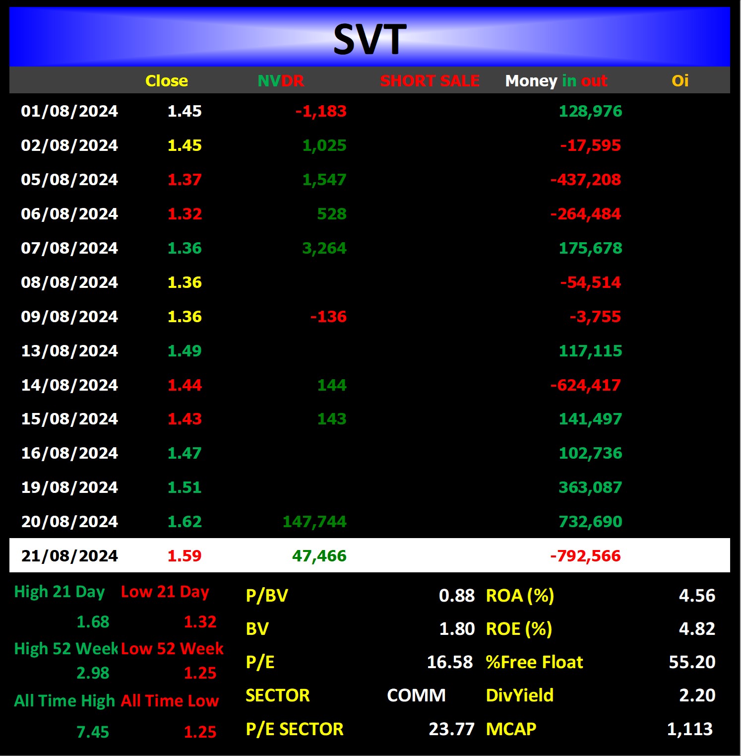 สำนักข่าวอินโฟเควสท์ (22 ส.ค. 2567)--ราคาหุ้น SVT พุ่ง 5.66% หรือเพิ่มขึ้น 0.09 บาท มาที่ 1.68 บาท เมื่อเวลา 11.42 น. จากราคาเปิด 1.62 บาท ราคาสูงสุด 1.76 บาท ราคาต่ำสุด 1.57 บาท