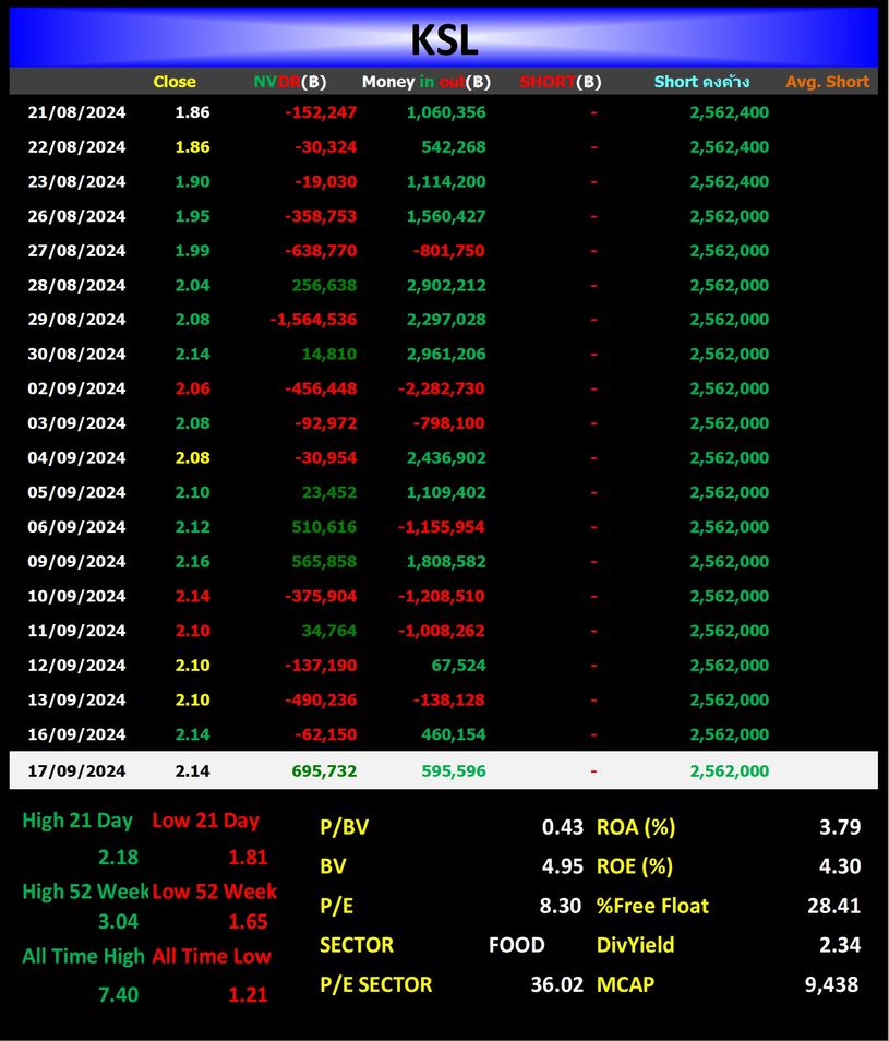 สำนักข่าวอินโฟเควสท์ (18 ก.ย. 2567)--หุ้น KSL พุ่ง 7.48% มาอยู่ที่ 2.30 บาท เพิ่มขึ้น 0.16 บาท มูลค่าซื้อขาย 15.37 ล้านบาท เมื่อเวลา 10.26 น. โดยเปิดตลาดที่ 2.18 บาท ราคาปรับตัวขึ้นสูงสุดที่ 2.32 บาท และราคาปรับตัวลงต่ำสุดที่ 2.18 บาท