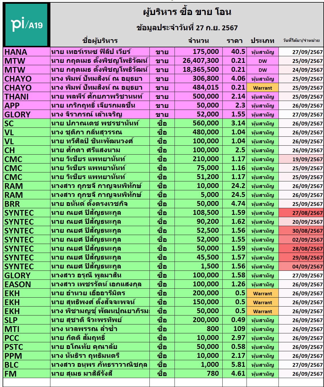 🔥🔥สรุปผู้บริหาร ซื้อ ขาย โอน 📅 วันรายงาน 27/9/2024