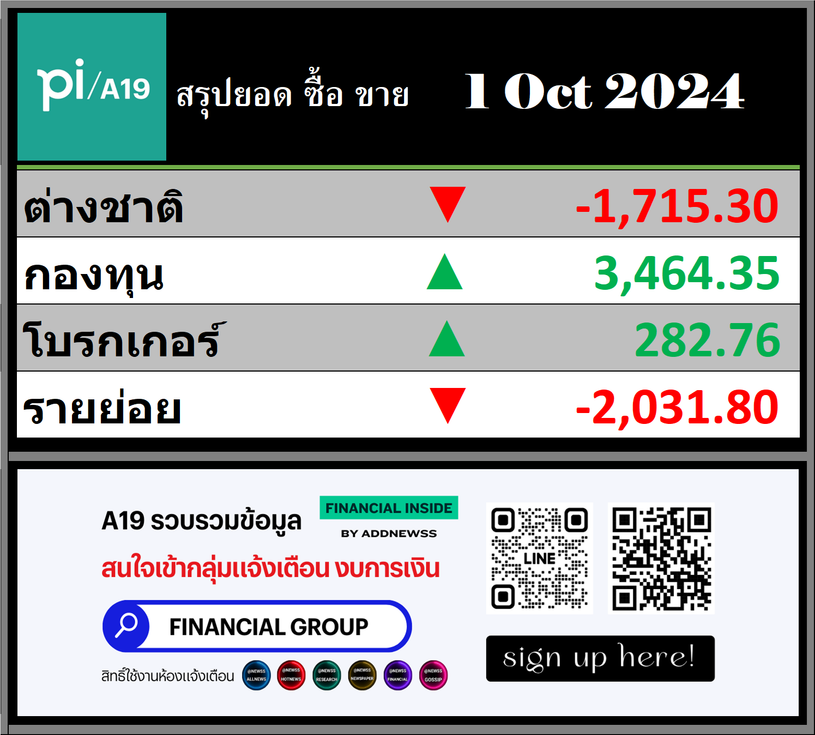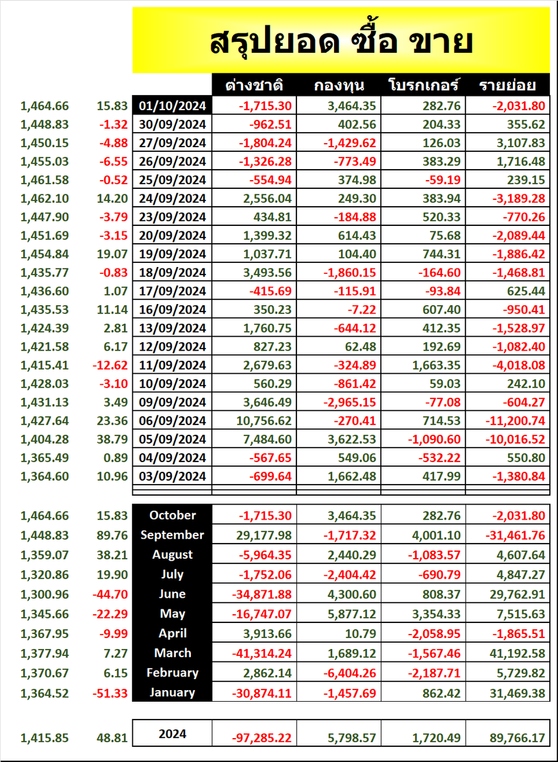 1 ต.ค. 2567 ต่างชาติ ขาย 5 วันติด อีก 🔴-1,715.30 ล้านบาท