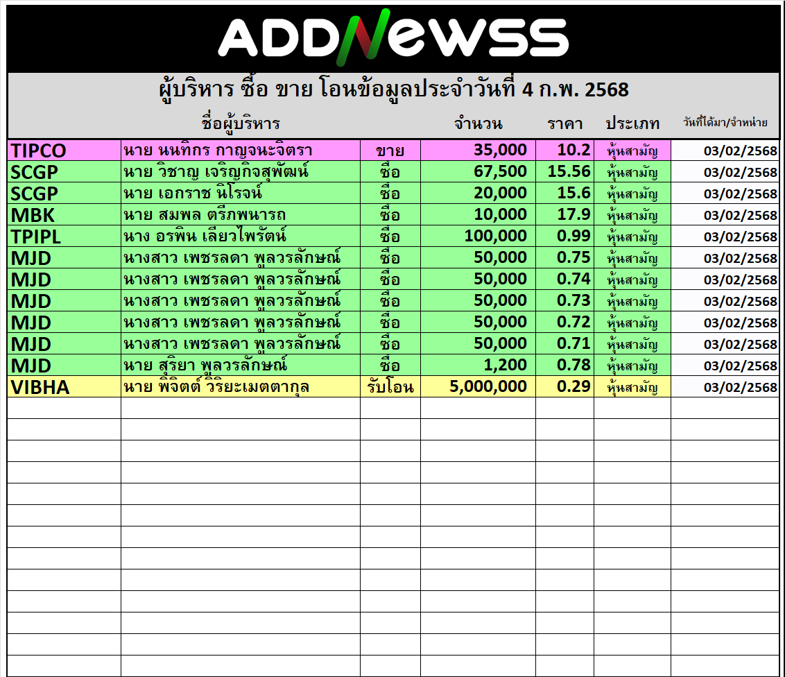🔥🔥สรุปผู้บริหาร ซื้อ ขาย โอน 📅 วันรายงาน 04/02/2025 📅 2025-02-04 16:10 ✎ administrator 🗇 👨💼MD 👍 - แชร์โพสต์นี้ 🔥🔥สรุปผู้บริหาร ซื้อ ขาย โอน 📅 วันรายงาน 04/02/2025 ⭐⭐แนะนำดูย้อนหลังผ่านหน้าเว็บ ครับ https://addnewss.news/post?catid=007 ดูย้อนหลังรายตัว พิมพ์ชื่อหุ้น ครับ https://addnewss.news/md/PROEN