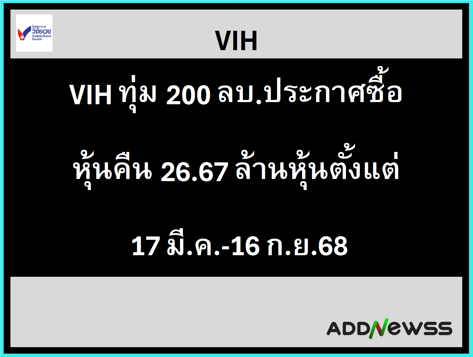 IQ > VIH ทุ่ม 200 ลบ.ประกาศซื้อหุ้นคืน 26.67 ล้านหุ้นตั้งแต่ 17 มี.ค.-16 ก.ย.68