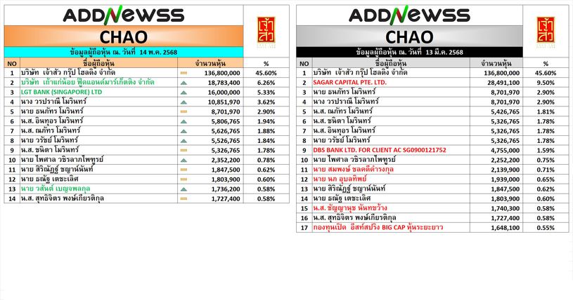 เถ้าแก่น้อย รายงานถือ CHAO รวม 18,783,400 ขึ้นอันดับ 2 คิดเป็น 6.26%
