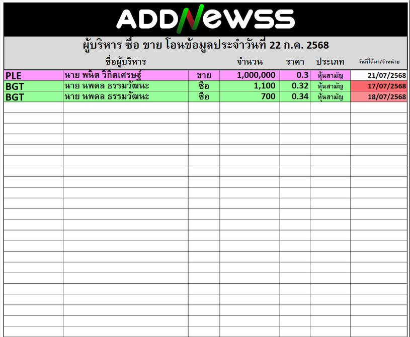 🔥🔥สรุปผู้บริหาร ซื้อ ขาย โอน 📅 วันรายงาน 22/07/2025 📅 2025-07-22 16:06 ✎ administrator 🗇 👨💼MD 👍 - แชร์โพสต์นี้ 🔥🔥สรุปผู้บริหาร ซื้อ ขาย โอน 📅 วันรายงาน 22/07/2025 ==== ⭐⭐แนะนำดูย้อนหลังผ่านหน้าเว็บ ครับ https://addnewss.news/post?catid=007 ดูย้อนหลังรายตัว พิมพ์ชื่อหุ้น ครับ https://addnewss.news/md?page=1&symbol=PLE ดูรายชื่อหุ้นผู้ถือหุ้นใหญ่ https://addnewss.news/shareholder?symbol=PLE