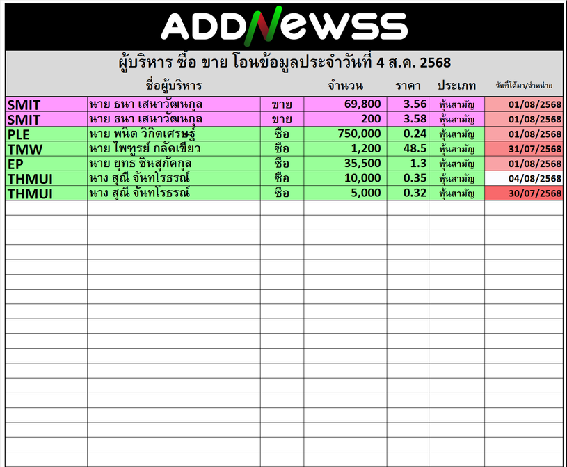 🔥🔥สรุปผู้บริหาร ซื้อ ขาย โอน 📅 วันรายงาน 04/08/2025