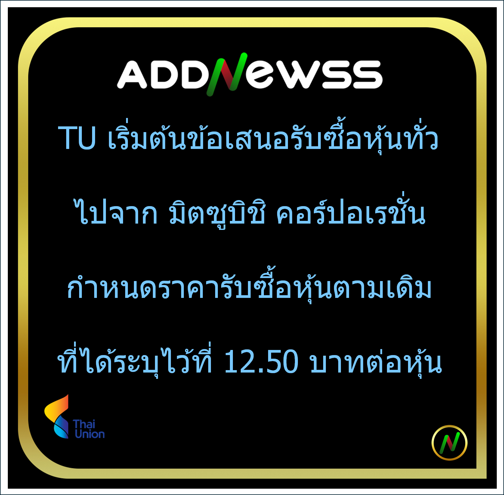 HOI> TU เริ่มต้นข้อเสนอรับซื้อหุ้นทั่วไปจาก มิตซูบิชิ คอร์ปอเรชั่น กำหนดราคารับซื้อหุ้นตามเดิมที่ได้ระบุไว้ที่ 12.50 บาทต่อหุ้น เปิดให้ตอบรับข้อเสนอรับซื้อหุ้นตั้งแต่ 8 ก.ย.- 26 ก.ย. 68