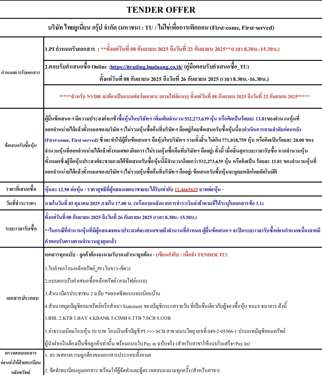 รายละเอียดการทำ TENDER OFFER หุ้น TU,TU-R รับซื้อหุ้นทั้งหมดจำนวน 532,273,639 หุ้น (ไม่ใช่เพื่อการเพิกถอน) (First-come, First-served)