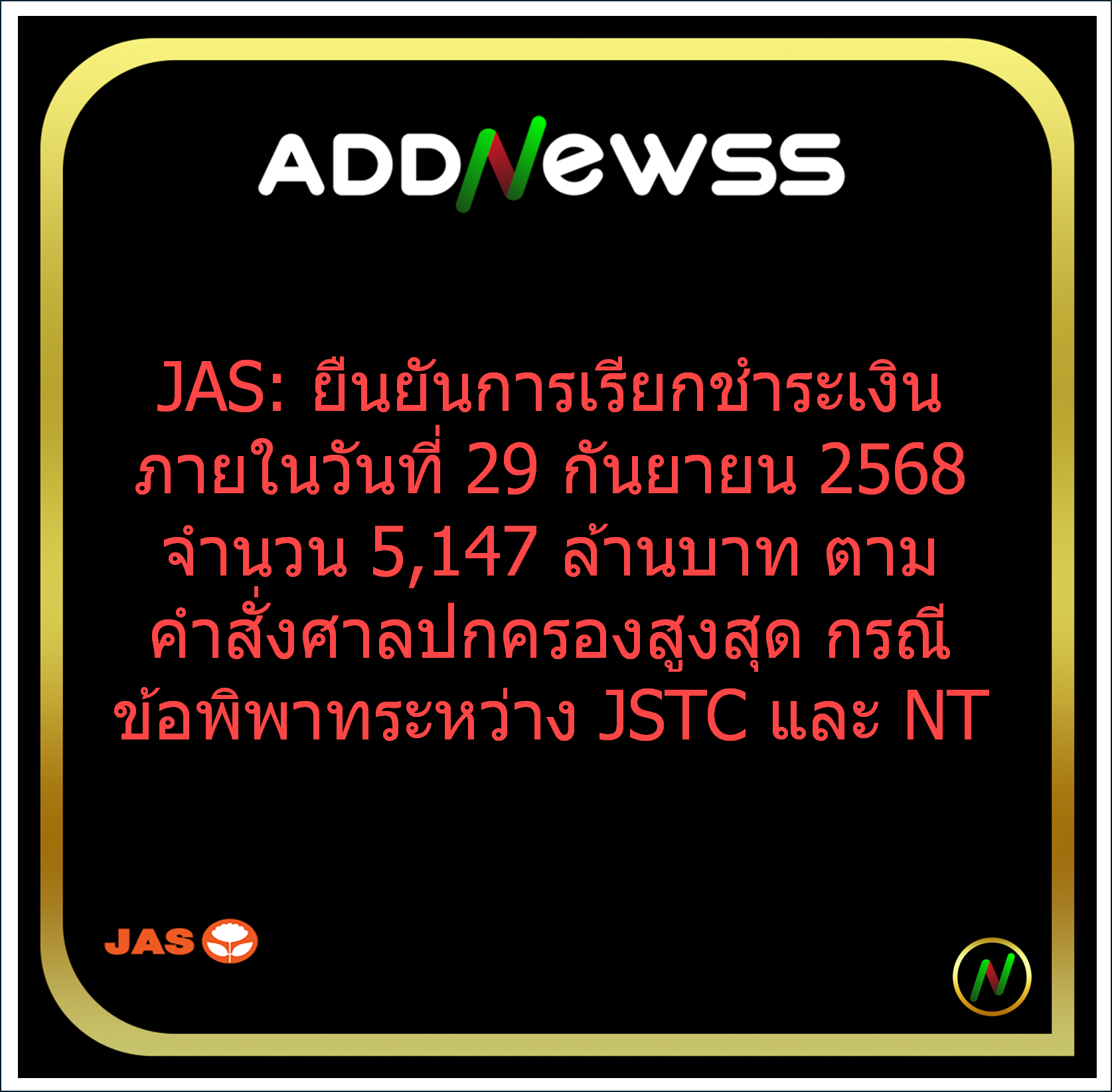IQ > JAS: ยืนยันการเรียกชำระเงินภายในวันที่ 29 กันยายน 2568 จำนวน 5,147 ล้านบาท ตามคำสั่งศาลปกครองสูงสุด กรณีข้อพิพาทระหว่าง JSTC และ NT
