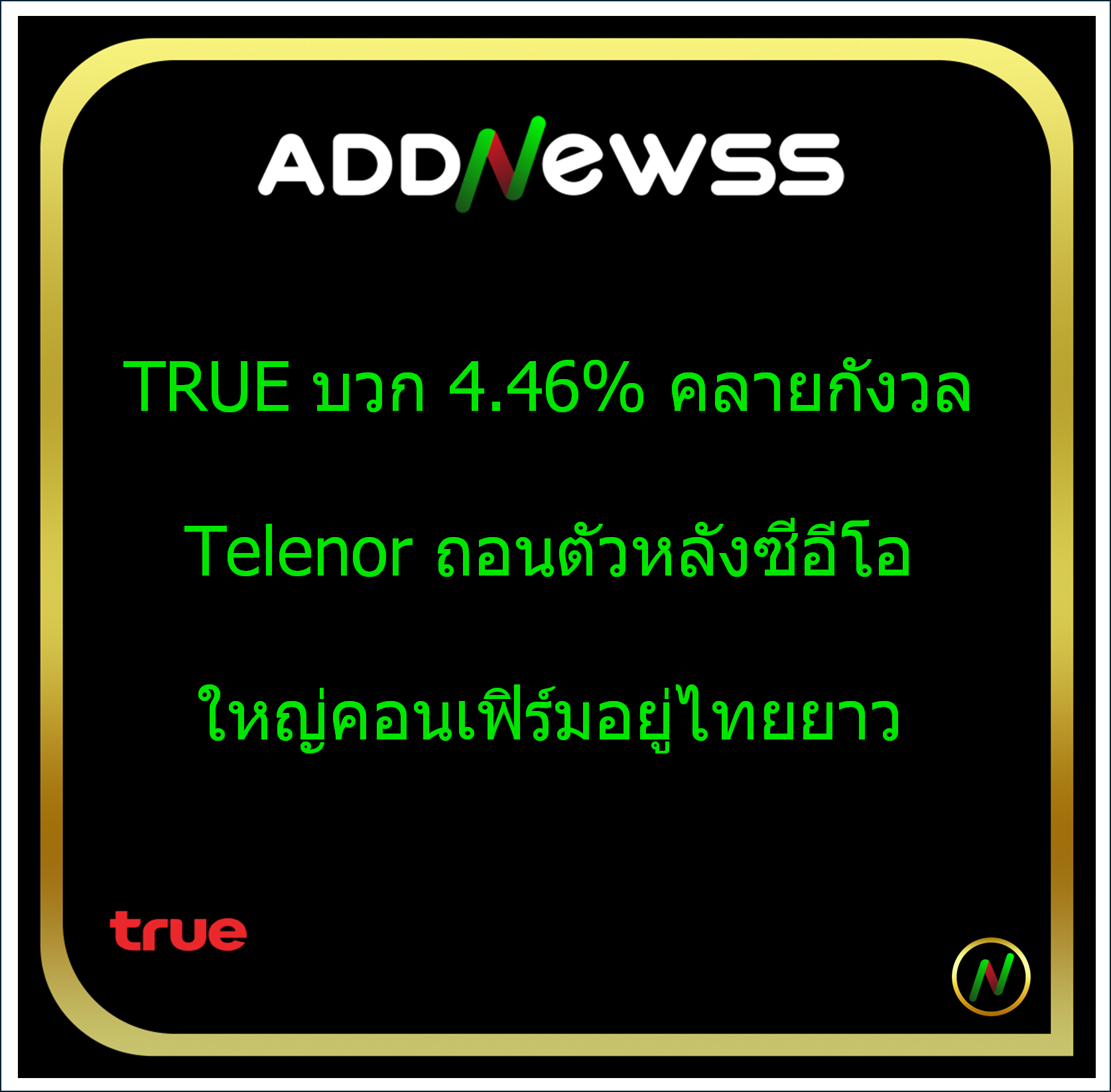 IQ > HILITE: TRUE บวก 4.46% คลายกังวล Telenor ถอนตัวหลังซีอีโอใหญ่คอนเฟิร์มอยู่ไทยยาว