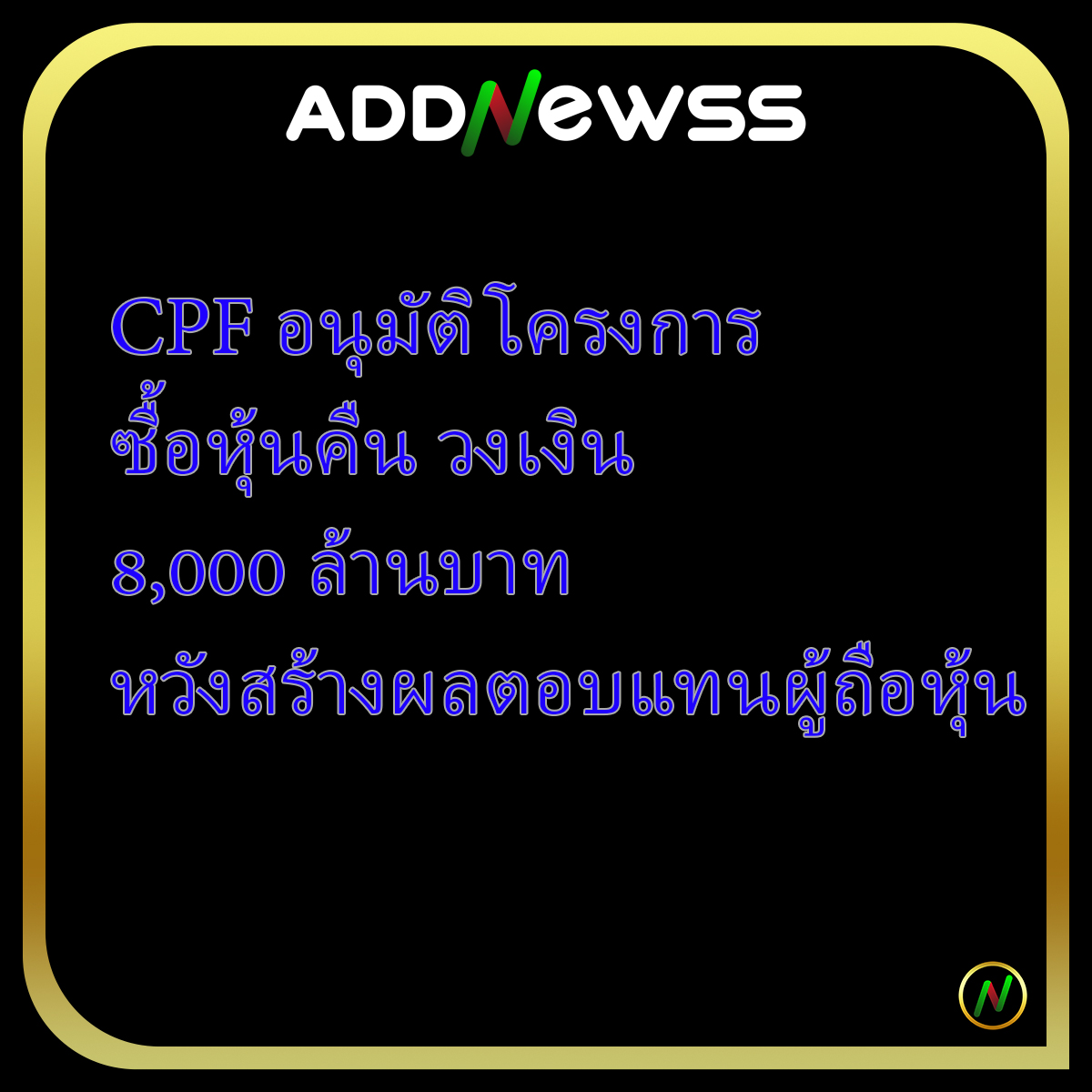 บริษัท เจริญโภคภัณฑ์อาหาร จำกัด (มหาชน) หรือ CPF แจ้งตลาดหลักทรัพย์ฯ ว่า ที่ประชุมคณะกรรมการบริษัทครั้งที่ 7/2568 เมื่อวันที่ 2 ตุลาคม 2568 มีมติอนุมัติโครงการ ซื้อหุ้นคืนเพื่อบริหารทางการเงิน (Treasury Stock) วงเงินไม่เกิน 8,000 ล้านบาท