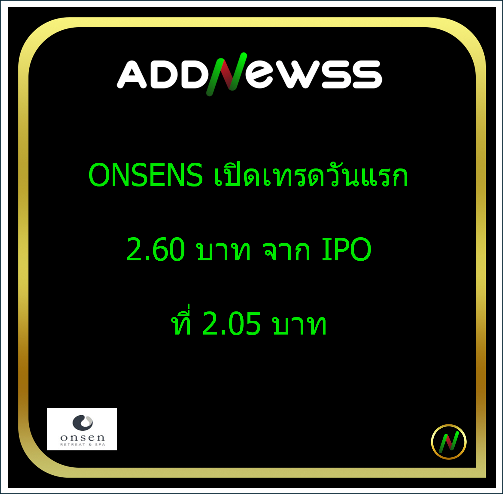 หุ้น ONSENS เปิดเทรดวันแรกที่ 2.60 บาท เพิ่มขึ้น 0.55 บาท หรือเพิ่มขึ้น +26.83% จากราคา IPO 2.05 บาท
