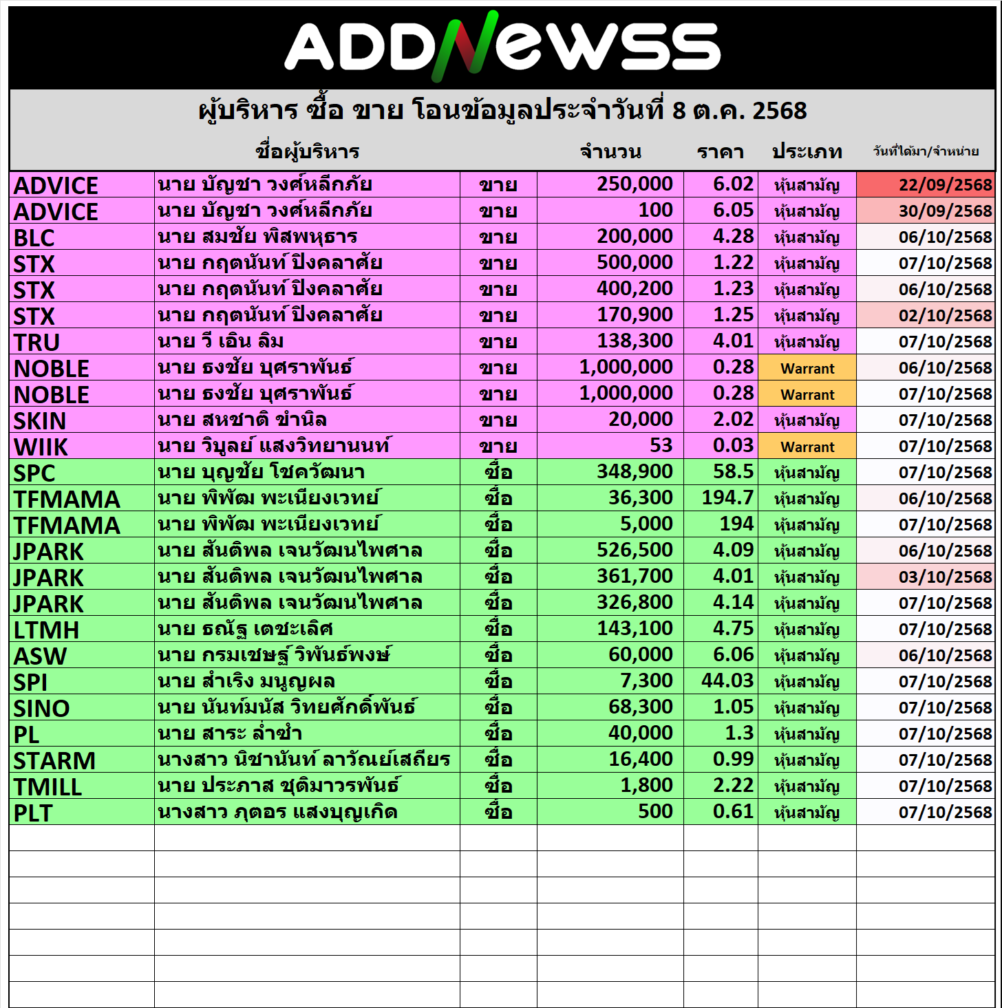🔥🔥สรุปผู้บริหาร ซื้อ ขาย โอน 📅 วันรายงาน 08/10/2025