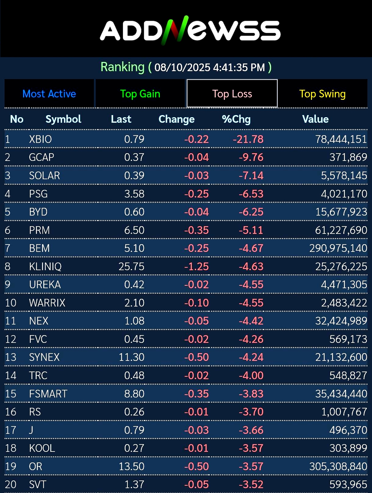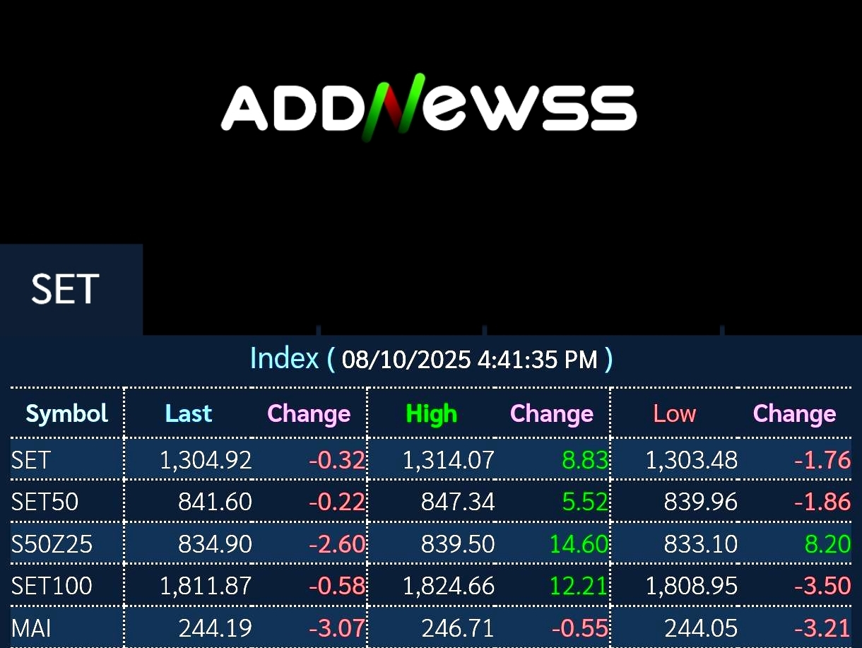 🟥ช่วงบ่าย SET ปิดที่ 1,304.92 ลดลง -0.32 จุด หรือ -0.02% 📅 2025-10-08 16:59 ✎ jaohkc 🗇 📰News 👍 - แชร์โพสต์นี้ 08/10/2568 📊เย็นวันนี้ดัชนีตลาดหุ้นไทยปิดที่ 1,304.92 ลดลง -0.32 จุด หรือ -0.02% ⬆️สูงสุดที่ 1,314.07 / +8.83 จุด ⬇️ต่ำสุดที่ 1,303.48 / -1.76 จุด 💰มูลค่าการซื้อขาย 37,346.56 ล้านบาท
