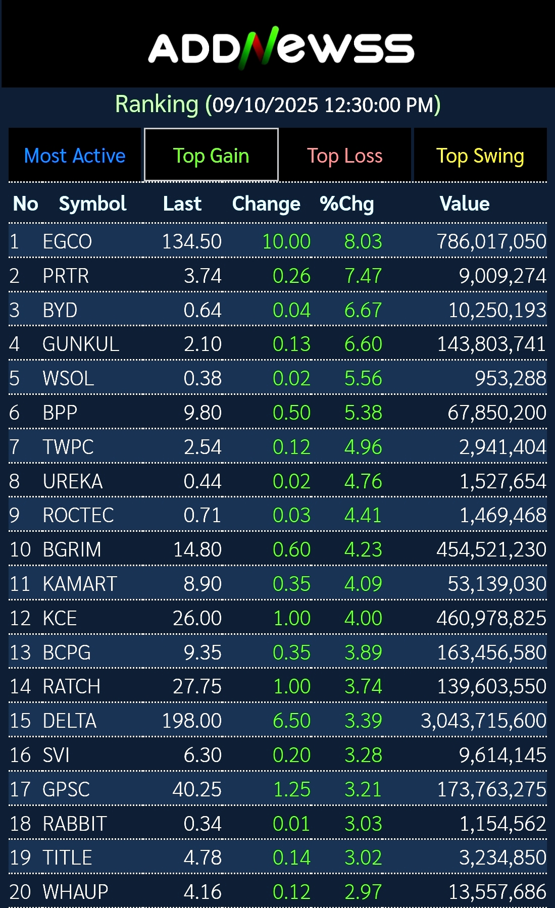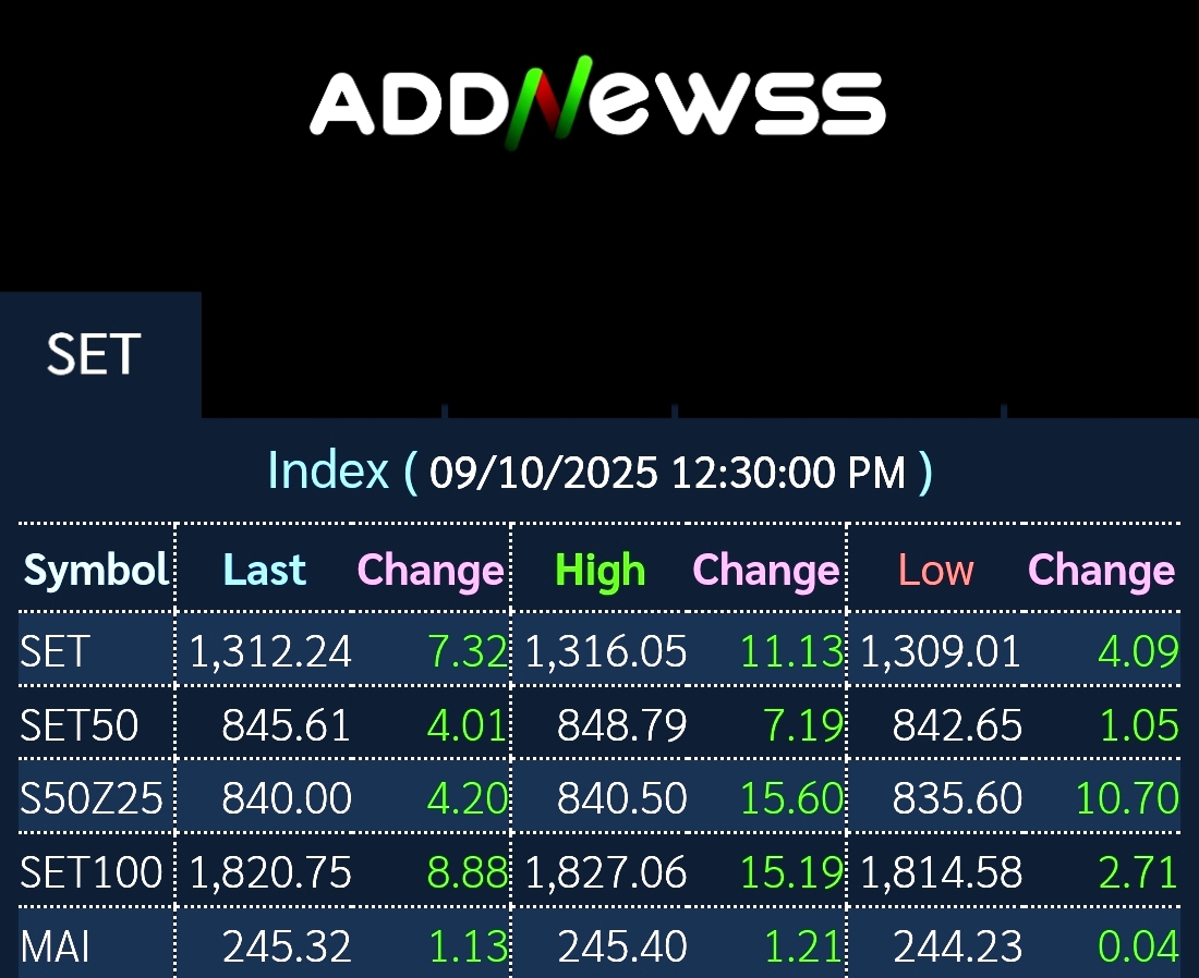 🟩ช่วงเช้า SET ปิดที่ 1,312.24 เพิ่มขึ้น +7.32 จุด หรือ +0.56% 📅 2025-10-09 12:37 ✎ jaohkc 🗇 📰News 👍 - แชร์โพสต์นี้ 09/10/2568 📊เช้าวันนี้ดัชนีตลาดหุ้นไทยปิดที่ 1,312.24 เพิ่มขึ้น +7.32 จุด หรือ +0.56% ⬆️สูงสุดที่ 1,316.05 / +11.13 จุด ⬇️ต่ำสุดที่ 1,309.01 / +4.09 จุด 💰มูลค่าการซื้อขาย 22,204.78 ล้านบาท