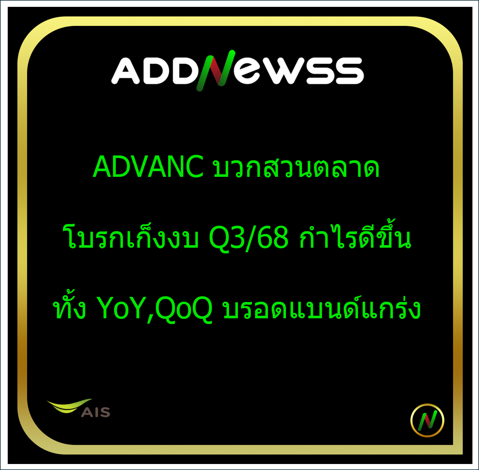 IQ > -ADVANC บวกสวนตลาด โบรกเก็งงบ Q3/68 กำไรดีขึ้นทั้ง YoY,QoQ บรอดแบนด์แกร่ง