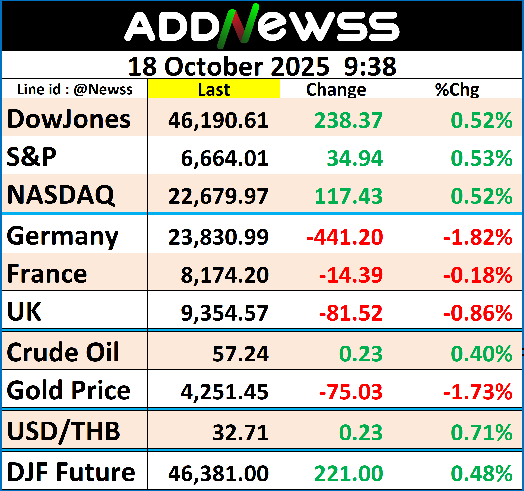 ทั้งนี้ ดัชนีเฉลี่ยอุตสาหกรรมดาวโจนส์ปิดที่ 46,190.61 จุด เพิ่มขึ้น 238.37 จุด หรือ +0.52%, ดัชนี S&P500 ปิดที่ 6,664.01 จุด เพิ่มขึ้น 34.94 จุด หรือ +0.53% และดัชนี Nasdaq ปิดที่ 22,679.98 จุด เพิ่มขึ้น 117.44 จุด หรือ +0.52%