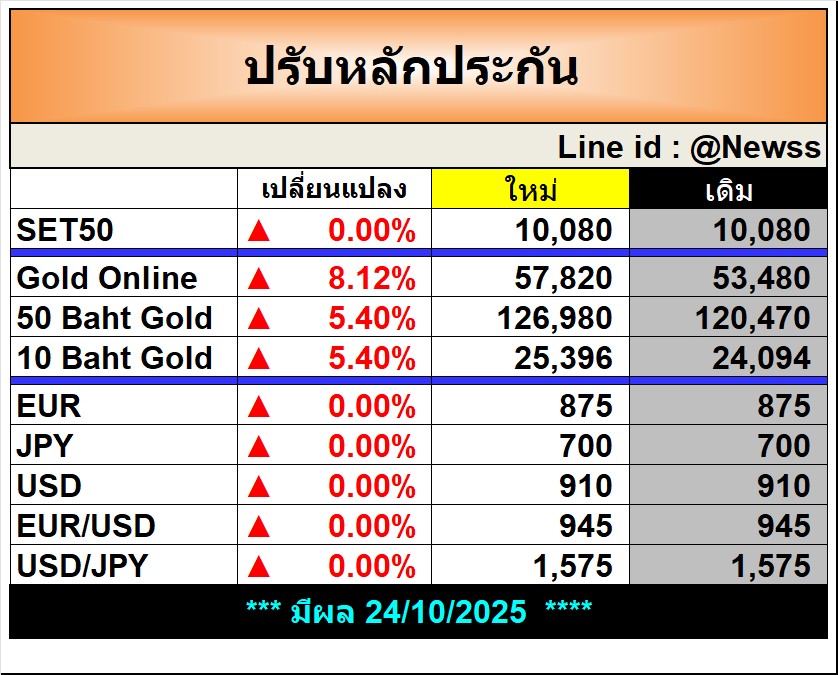 ประกาศเปลี่ยนแปลงหลักประกันสำหรับการซื้อขายสัญญาซื้อขายล่วงหน้า มีผลบังคับใช้วันที่ 24 ตุลาคม 2568 📅 2025-10-21 10:15 ✎ pechpinks 🗇 📰News 👍 - แชร์โพสต์นี้