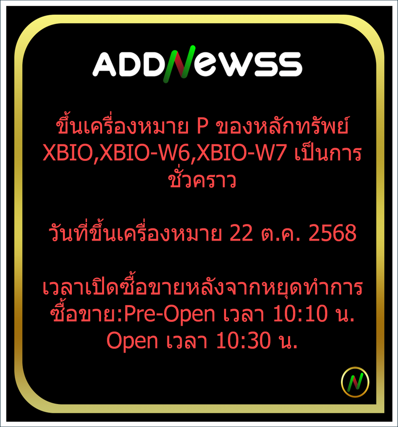 SET: ตลาดหลักทรัพย์ขึ้นเครื่องหมาย P ของหลักทรัพย์ XBIO,XBIO-W6,XBIO-W7 เป็นการชั่วคราว เนื่องจาก Auto Pause