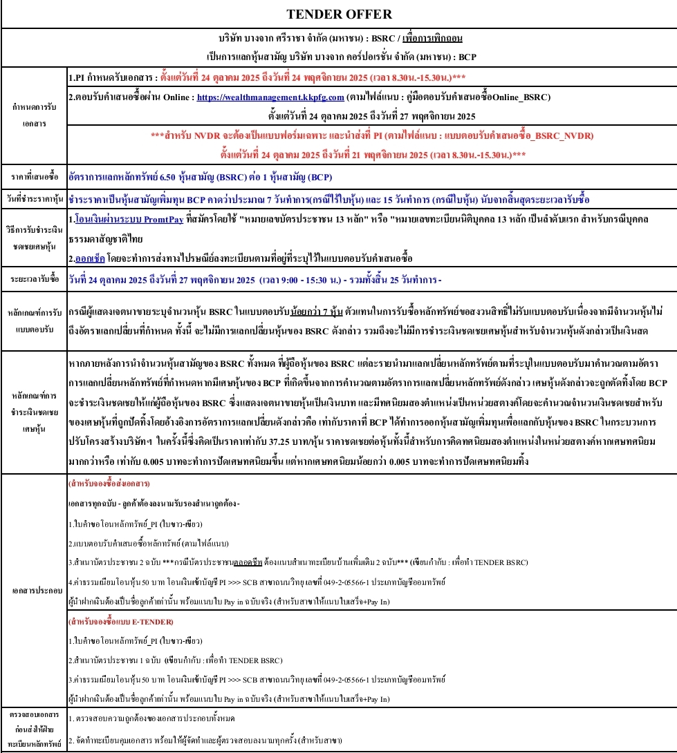 ละเอียดการทำ TENDER OFFER หุ้น BSRC, BSRC-R (เพื่อการเพิกถอน)