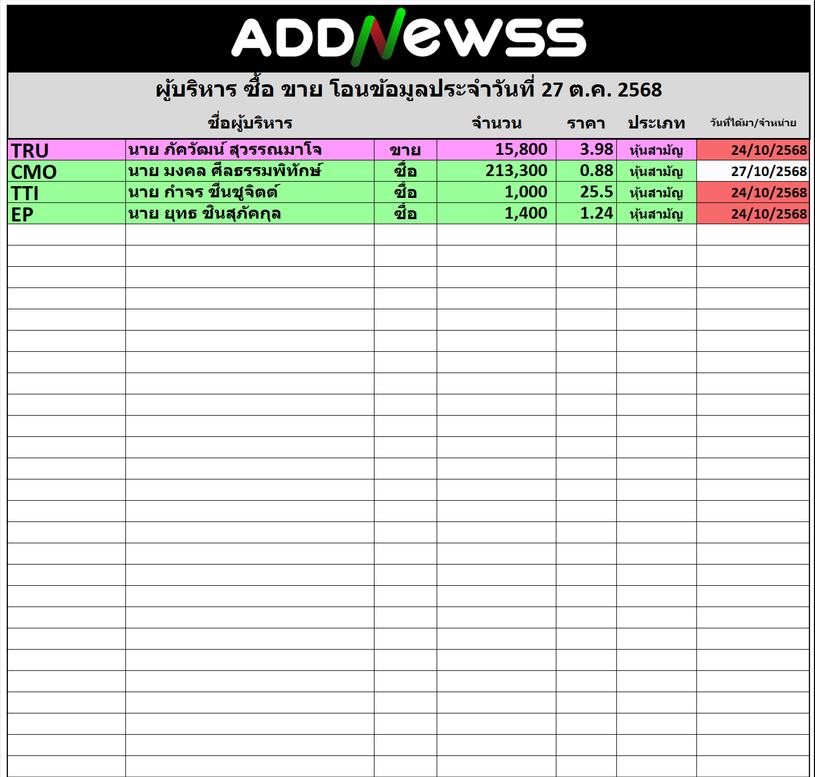 🔥🔥สรุปผู้บริหาร ซื้อ ขาย โอน 📅 วันรายงาน 27/10/2025