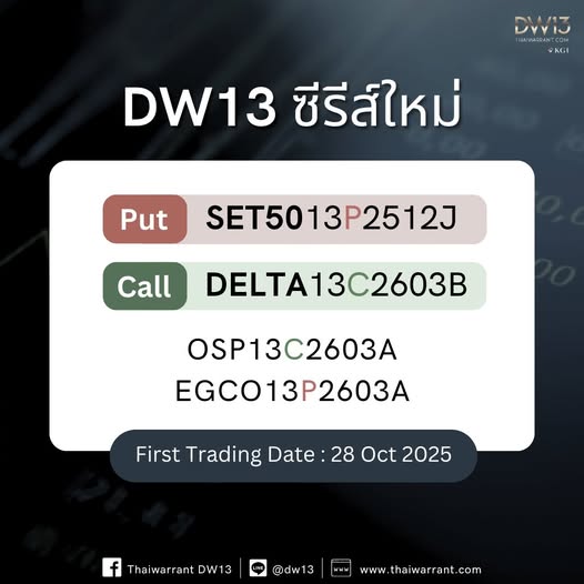 พบกับ DW13 call อ้างอิง DELTA ซีรีส์ใหม่ล่าสุด มาพร้อมกับ SET50 Put ตัวใหม่ https://www.thaiwarrant.com/kgi-dw/newdw