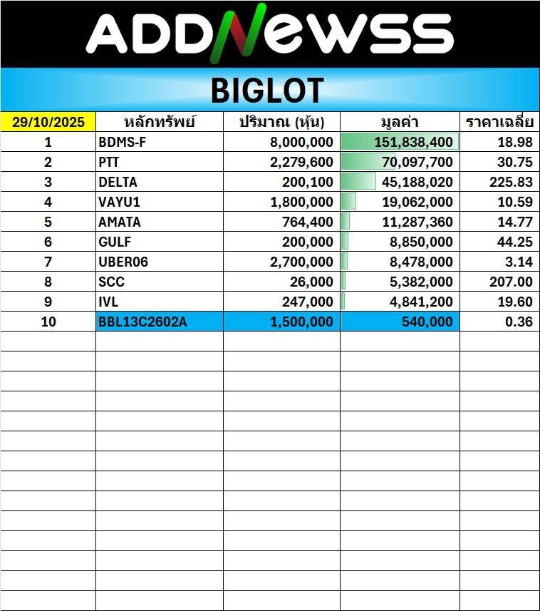 🔥BigLot 📅 29/10/2025 BDMS-F มีมูลค่าสูงสุด 151.8 ล้าน ที่ราคาเฉลี่ย 18.98 บ.