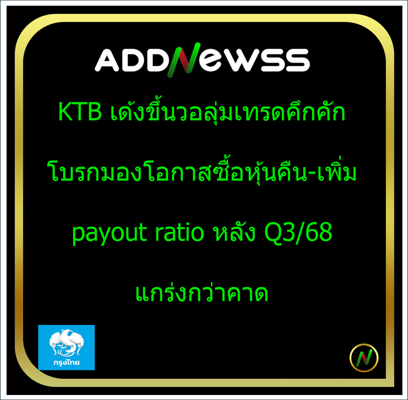 บล.กสิกรไทย ให้ราคาพื้นฐานหุ้น KTB ที่ 26.25 บาท มีมุมมองเชิงบวกหลังรายงานกำไร Q3/68 ที่ 1.46 หมื่นลบ. เพิ่มขึ้น 31% QoQ และ 32% YoY ผลประกอบการสูงกว่าคาด 18% และสอดคล้องกับประมาณการของตลาด กำไรที่สูงกว่าคาดเกิดจากกำไรจากการลงทุนที่รับรู้ได้สูงกว่าคาดและค่าใช้จ่ายดำเนินงาน (Opex) ต่ำกว่าคาด 7%
