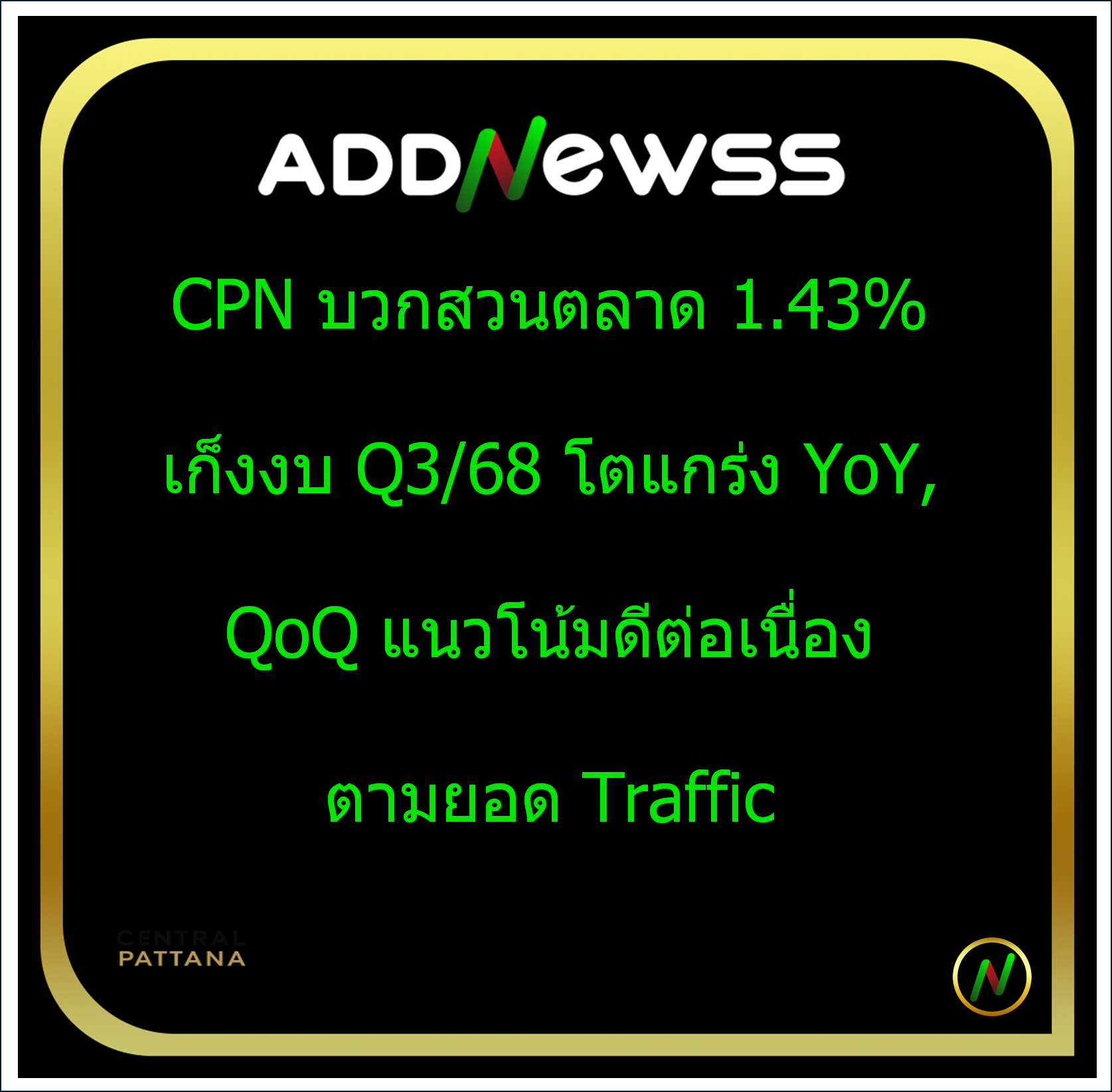 IQ > HILITE: CPN บวกสวนตลาด 1.43% เก็งงบ Q3/68 โตแกร่ง YoY,QoQ แนวโน้มดีต่อเนื่องตามยอด Traffic