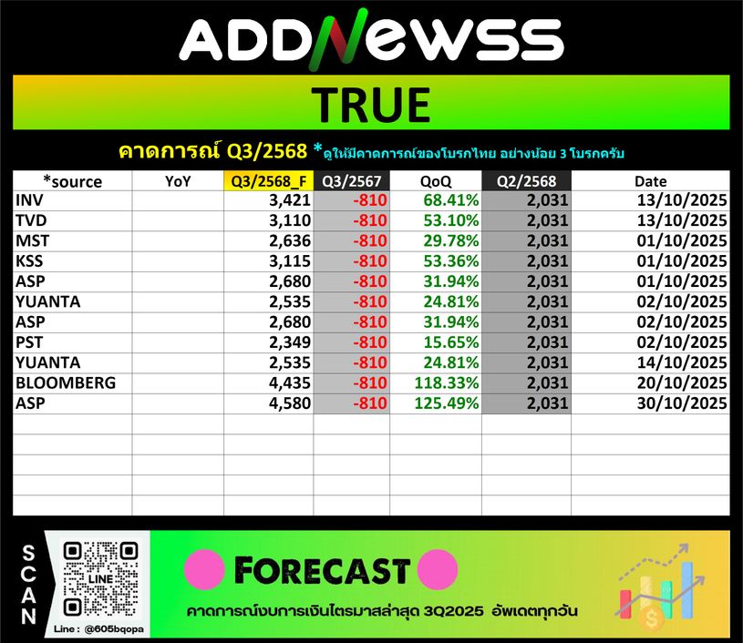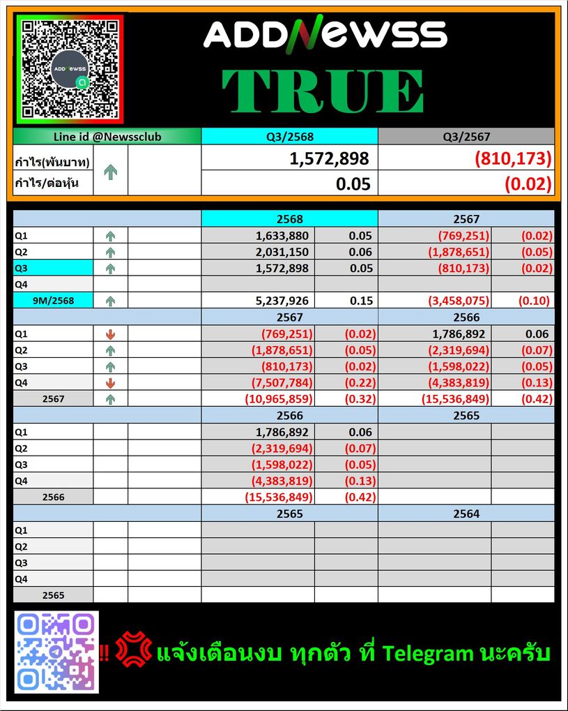 TRUE Q3/68 พลิกกำไร 1.57 พันลบ. จากขาดทุนปีก่อน—ต้นทุนการเงินลด-รายได้อื่นและส่วนแบ่งกำไรหนุน แม้รายได้รวมหด 7.1%YoY