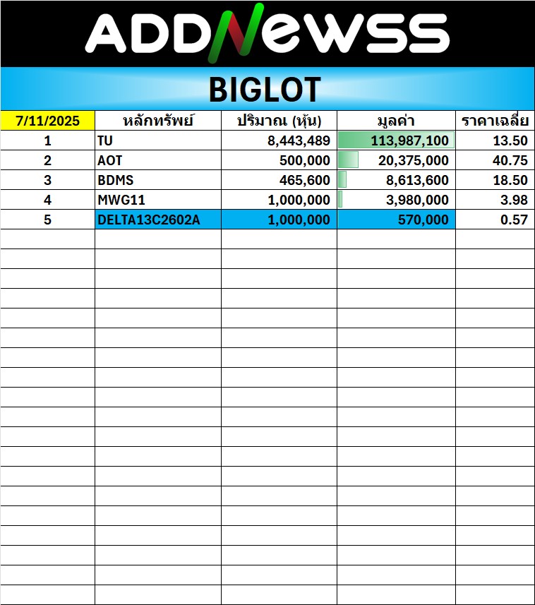 🔥BigLot 📅 07/11/2025 TU มีมูลค่าสูงสุด 114 ล้าน ที่ราคาเฉลี่ย 13.5 บ.