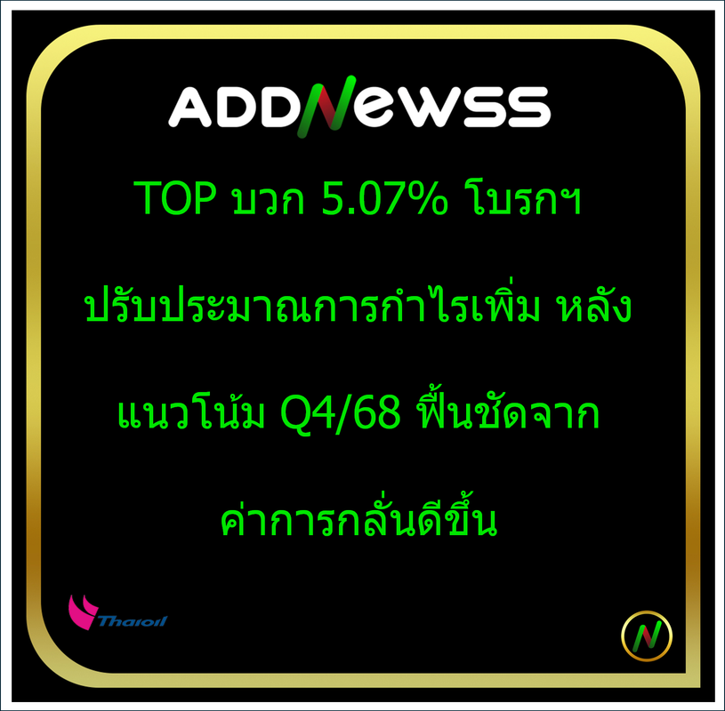 บล.ดาโอ (ประเทศไทย) ปรับเพิ่มประมาณการกำไรของบมจ.ไทยออยล์ [TOP] ในปี 68 เป็น 1.38 หมื่นล้านบาท จากเดิมที่ 1 หมื่นล้านบาท สะท้อนปัจจัยหนุนของค่าการกลั่น (Net GRM) ที่ปรับตัวสูงขึ้นชัดเจน ซึ่งอยู่ในระดับ 4.3-5.8 ดอลลาร์สหรัฐ/บาร์เรล จากเดิมที่ 4.2-5.7 ดอลลาร์สหรัฐ/บาร์เรล ทำให้เป็นผลบวกต่อผลการดำเนินงานไตรมาส 4/68 ของ TOP ที่ฟื้นตัวขึ้น ประกอบกับการที่มีโรงานผลิตกลับมาเปิดดำเนินการผลิตหลังจากปิดซ่อมไป ทำให้ช่วยชดเชยพรีเมียมน้ำมันดิบที่ทรงตัวสูงได้ และแนวโน้มของผลขาดทุนสต็อกน้ำมันเริ่มทยอยปรับตัวลง จากราคาน้ำมันที่เริ่มทรงตัวและมีทิศทางปรับตัวขึ้นตามฤดูกาล