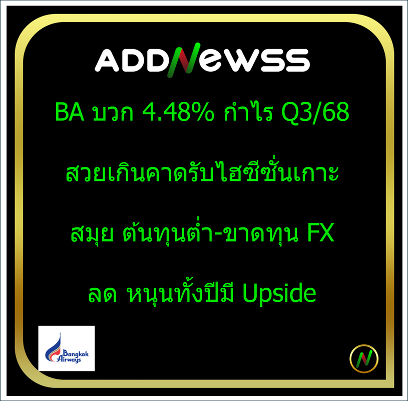 IQ > HILITE: BA บวก 4.48% กำไร Q3/68 สวยเกินคาดรับไฮซีซั่นเกาะสมุย ต้นทุนต่ำ-ขาดทุน FX ลด หนุนทั้งปีมี Upside