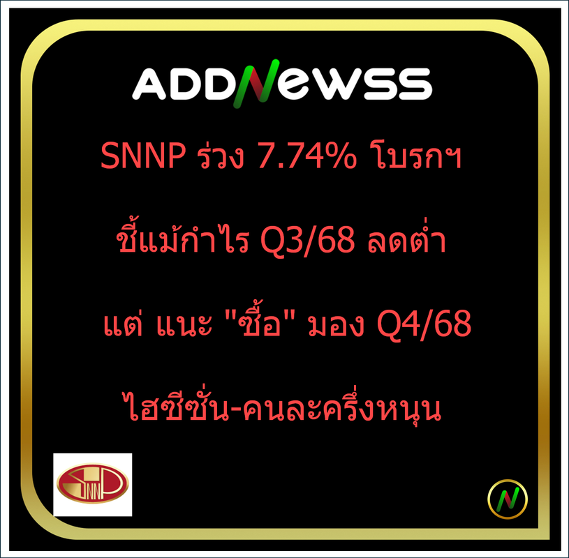 IQ > HILITE: SNNP ร่วง 7.74% โบรกฯ ชี้แม้กำไร Q3/68 ลดต่ำ แต่ แนะ "ซื้อ" มอง Q4/68 ไฮซีซั่น-คนละครึ่งหนุน