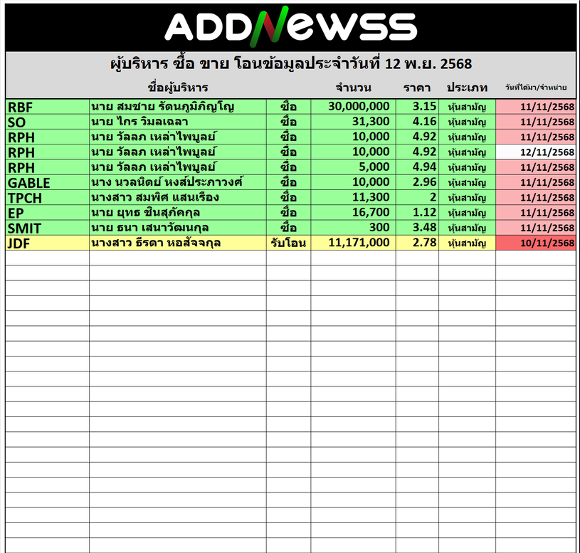 🔥🔥สรุปผู้บริหาร ซื้อ ขาย โอน 📅 วันรายงาน 12/11/2025