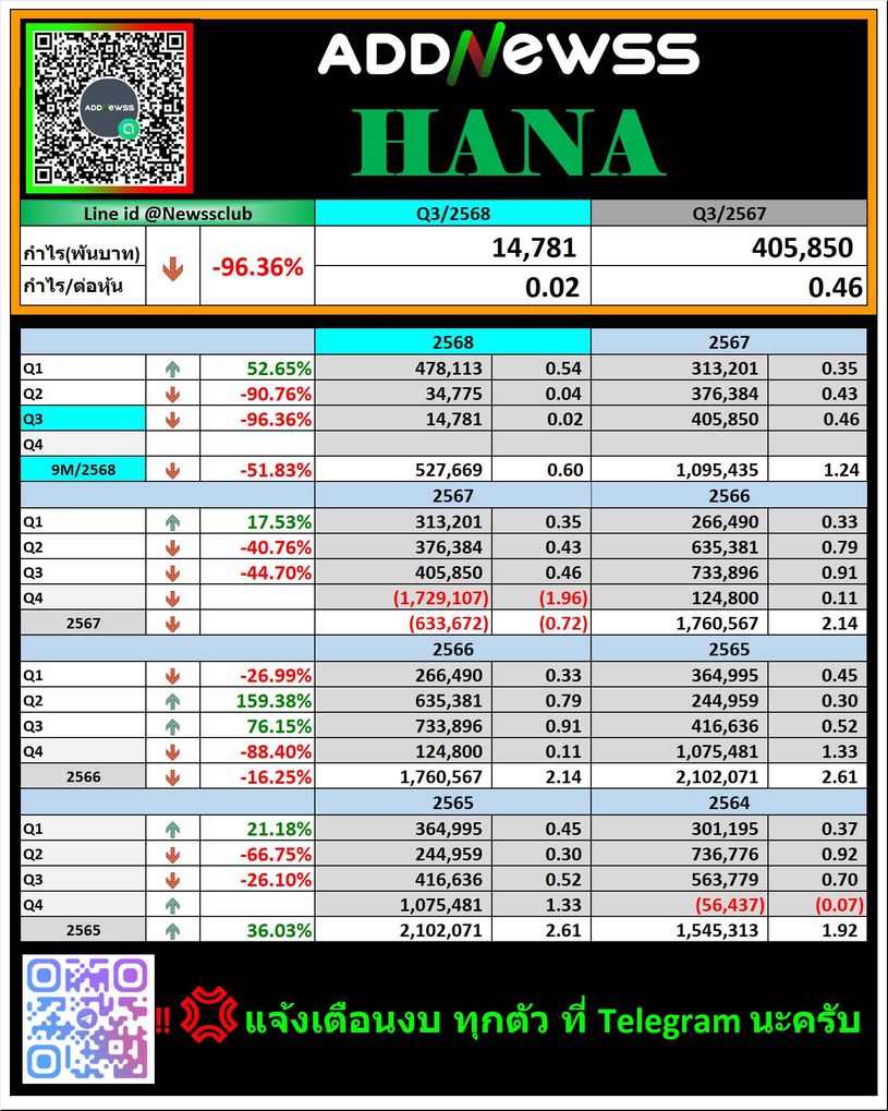 “HANA Q3/68 กำไรทรุด 96%YoY เหลือ 15 ลบ. ถูกกดดันบาทแข็ง–ยอดขายหด 13%”
