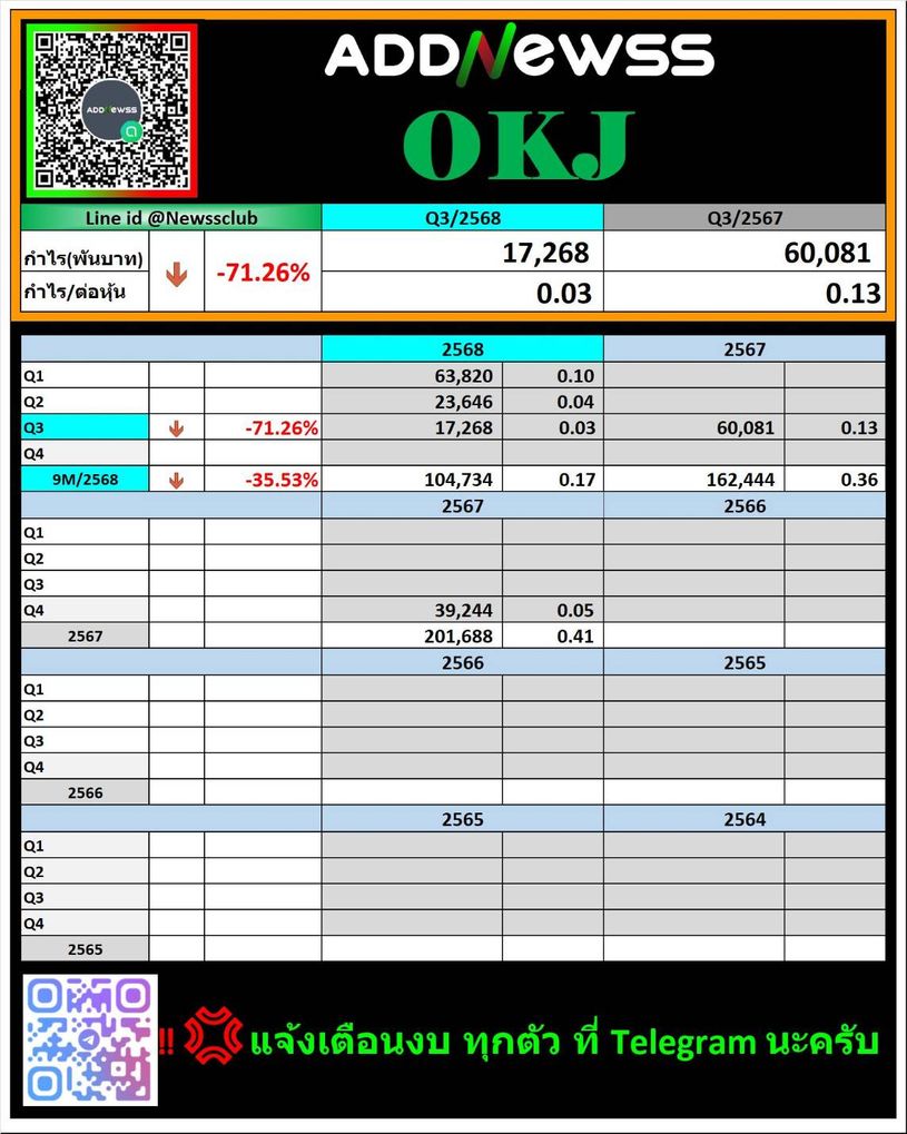 🔥OKJ Q3/2568 📅 2025-11-13 18:31 ✎ administrator 🗇 📰News 👍 - แชร์โพสต์นี้ 🔥OKJ Q3/2568 ‼️💢แจ้งเตือนงบ ทุกตัว ที่ Telegram ครับ 🔗Link เข้ากลุ่ม ครับ https://t.me/AddNewss พิมพ์ชื่อหุ้นดูทุกตัวได้ที่ Line OA ครับ 👇👇 🔥Line id : @newssclub https://lin.ee/cQcBpZD