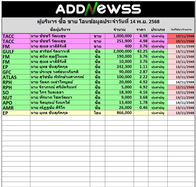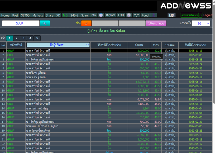 สารัชถ์ ซื้อ GULF 2,000,000 หุ้น 📅 2025-11-14 16:16 ✎ administrator 🗇 👨💼MD 👍 - แชร์โพสต์นี้ สารัชถ์ ซื้อ GULF 2,000,000 หุ้น 🔥🔥สรุปผู้บริหาร ซื้อ ขาย โอน 📅 วันรายงาน 14/11/2025 ==== ⭐⭐แนะนำดูย้อนหลังผ่านหน้าเว็บ ครับ https://addnewss.news/post?catid=007 ดูย้อนหลังรายตัว พิมพ์ชื่อหุ้น ครับ https://addnewss.news/md?page=1&symbol=GULF