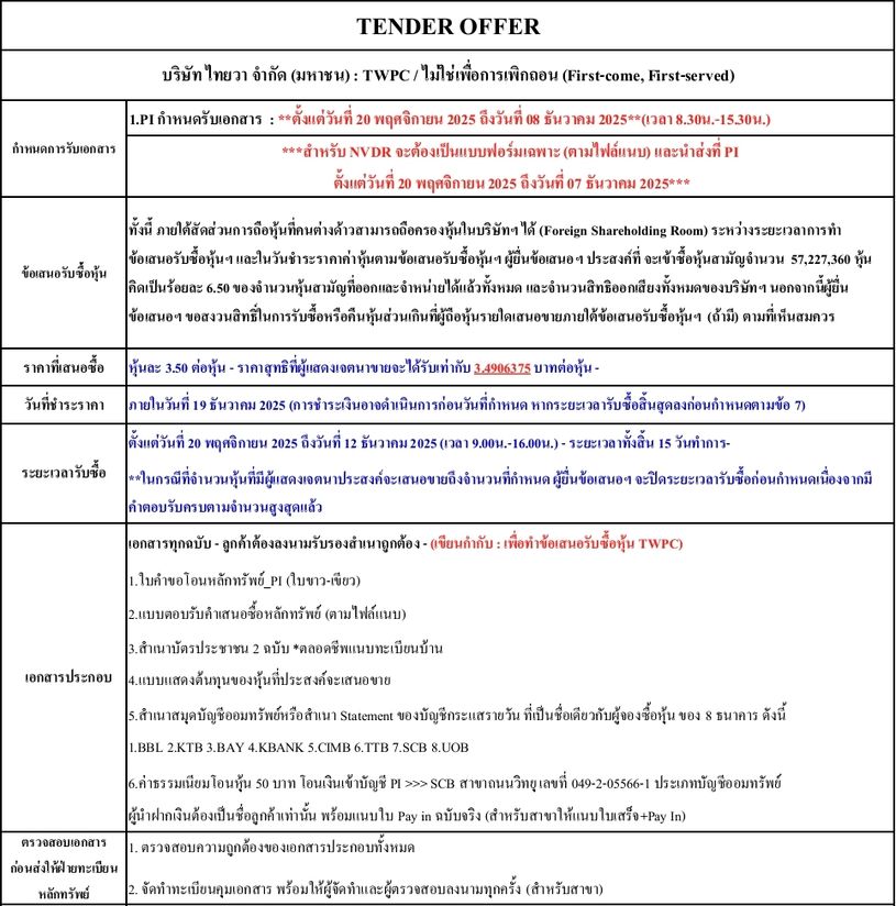 āļĢāļēāļĒāļĨāļ°āđāļāļĩāļĒāļāļāļēāļĢāļāļģ TENDER OFFER āļŦāļļāđāļ TWPC, TWPC-R āļĢāļąāļāļāļ·āđāļāļŦāļļāđāļāļāļąāđāļāļŦāļĄāļāļāļģāļāļ§āļ 57,227,360 āļŦāļļāđāļ (āđāļĄāđāđāļāđāđāļāļ·āđāļāļāļēāļĢāđāļāļīāļāļāļāļ) (First-come, First-served)