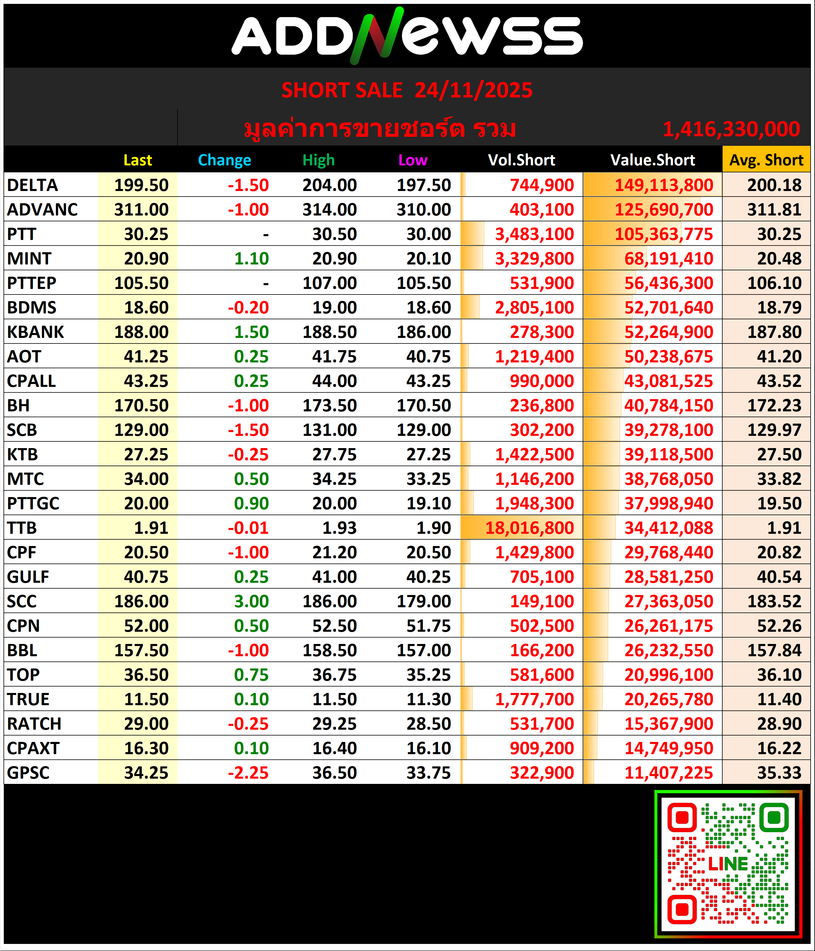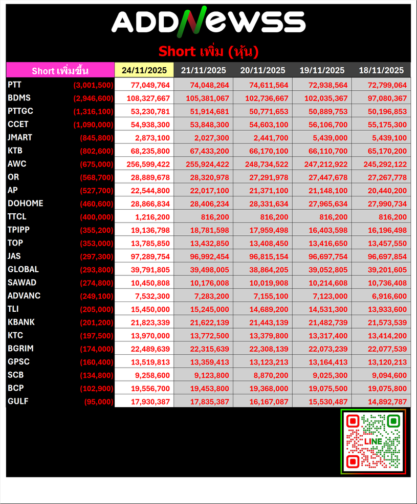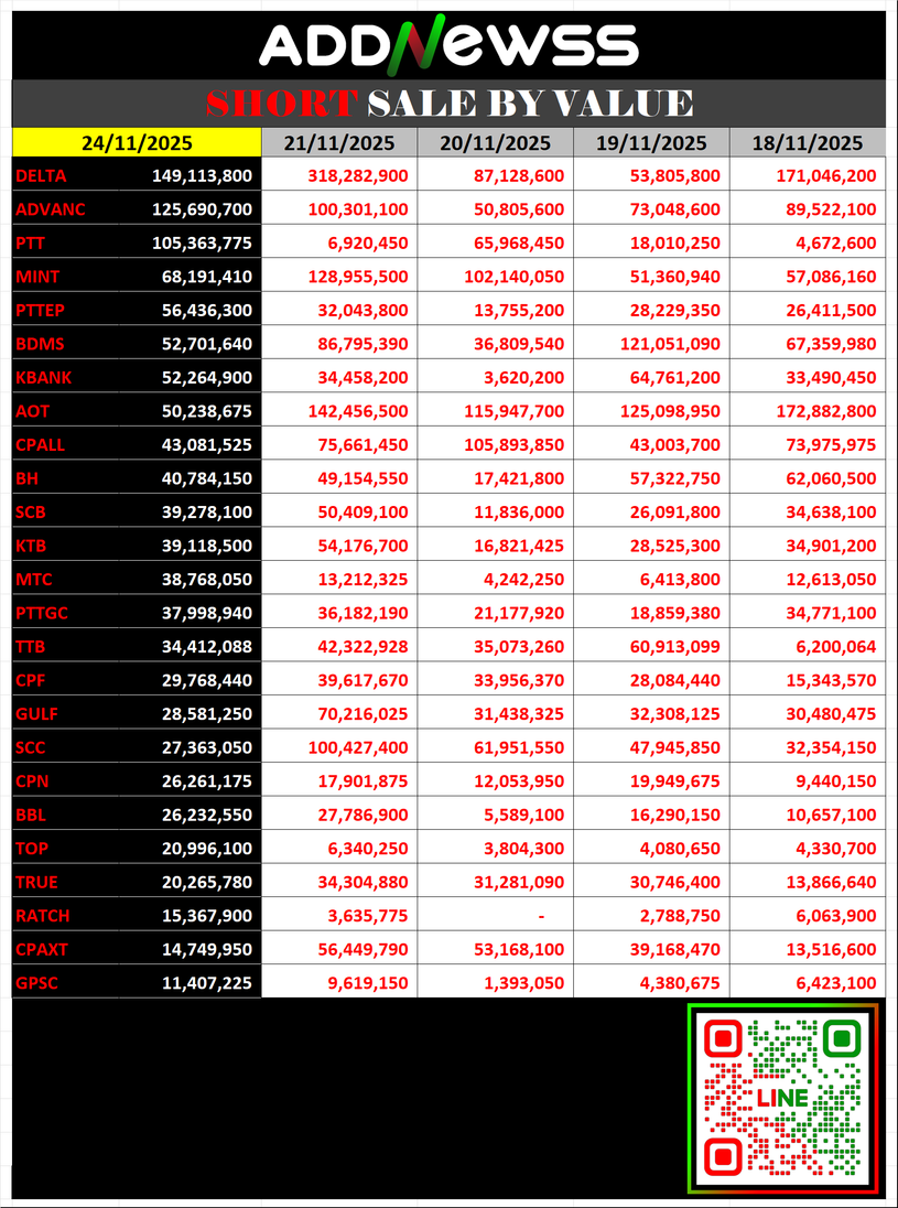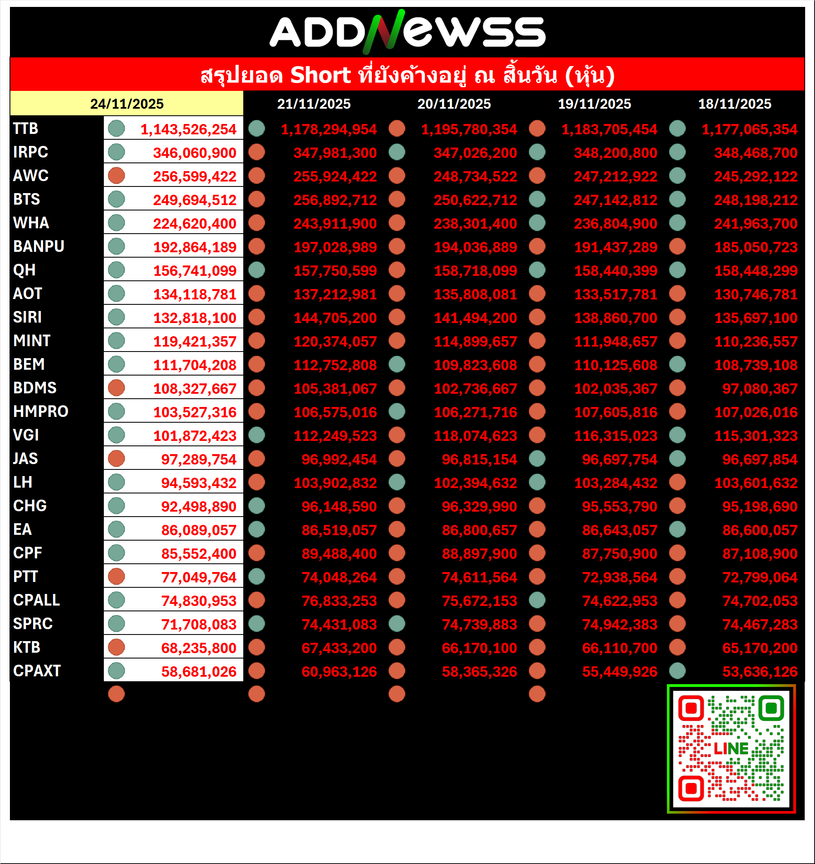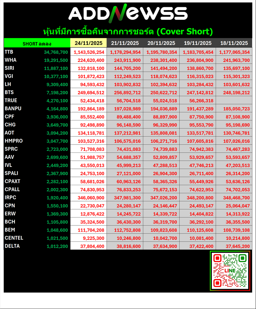 🔴🔴Short Sale 📅 24/11/2025 📅 2025-11-25 06:34 ✎ administrator 🗇 🔴Short 👍 - แชร์โพสต์นี้ 🔴🔴Short Sale 📅 24/11/2025 🟢30 อันดับ Cover Short 🔴30 อันดับ Short เพิ่ม “👀” ดู Short Sale ย้อนหลังได้ที่ https://addnewss.news/post?catid=002