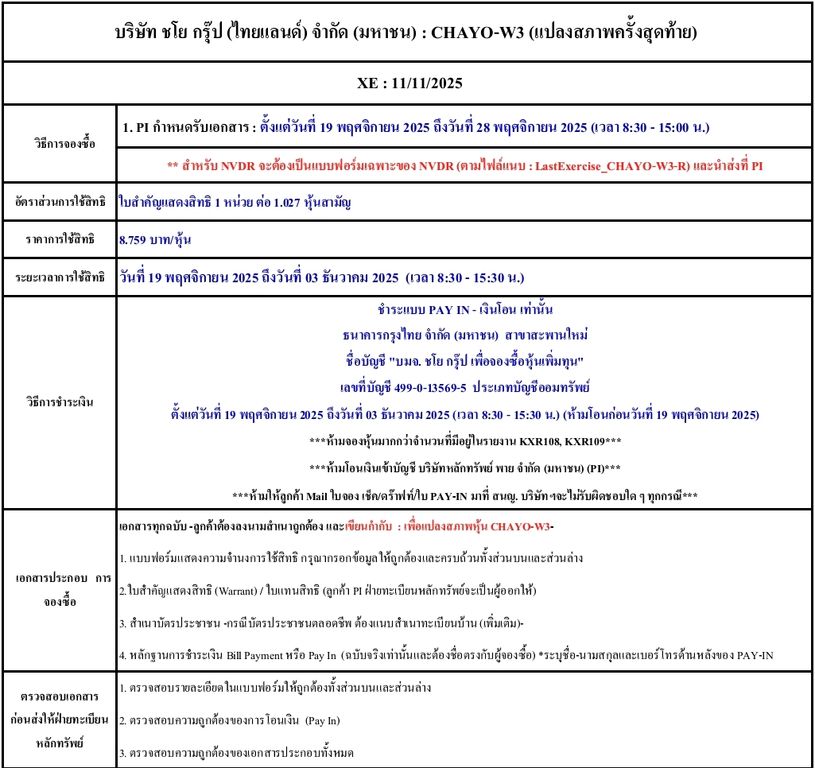 รายละเอียดการใช้สิทธิแปลงสภาพหุ้น : CHAYO-W3, CHAYO-W3-R (ครั้งสุดท้าย)